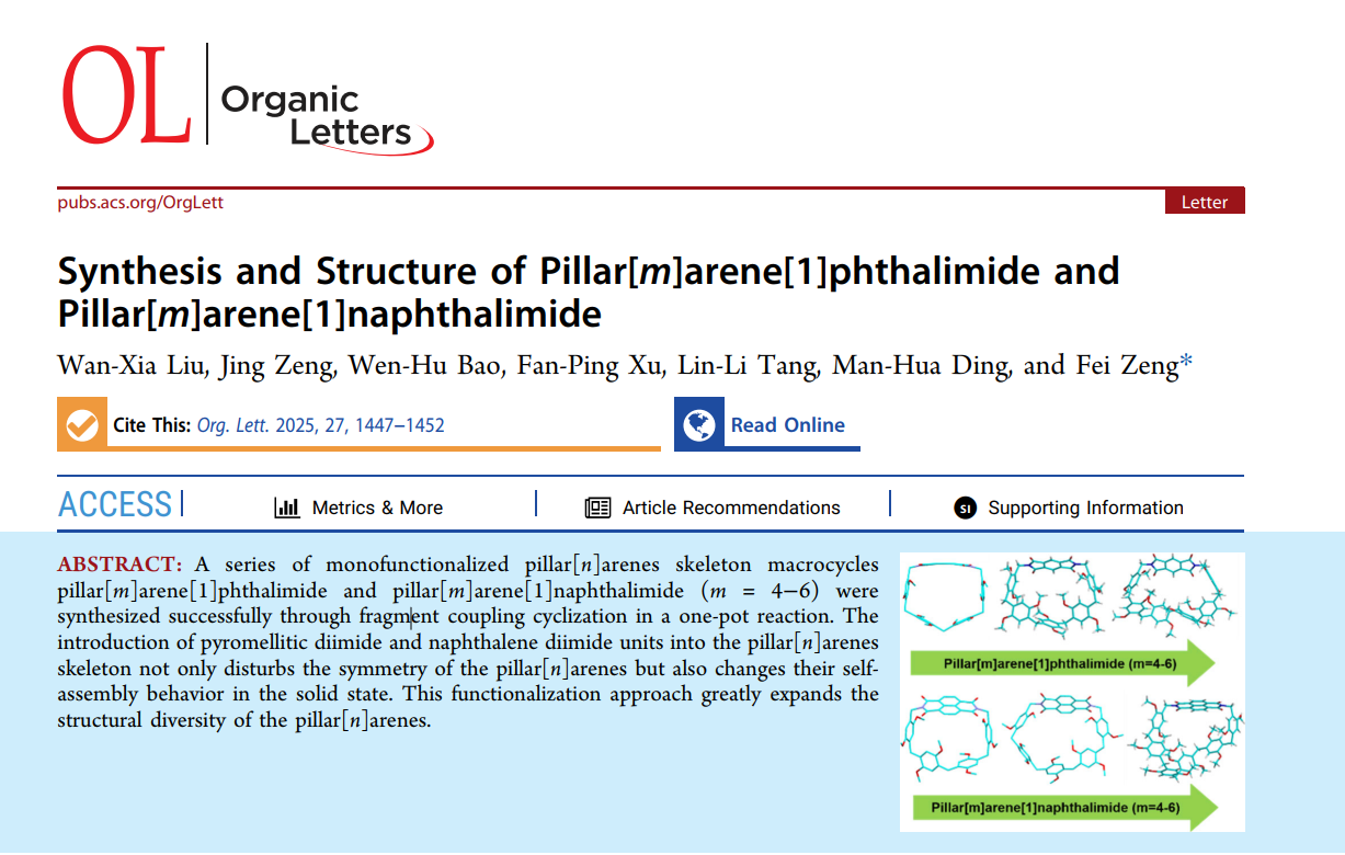 (本网讯 曾飞)2月3日,化学与生物工程学院2022级化学专业本科生刘晚霞以第一作者身份在国际知名期刊Organic Letters(中科院一区TOP)上发表题为《Synthesis and Structure of Pillar[m]arene[1]phthalimide and Pillar[m]arene[1]naphthalimide》(柱[m]芳烃[1]苯邻二甲酰亚胺与柱[m]芳烃[1]萘二甲酰亚胺的合成及结构)的高水平科研论文,是vwin德赢本科生人才培养质量进一步提升和学科专业建设的标志性成果。