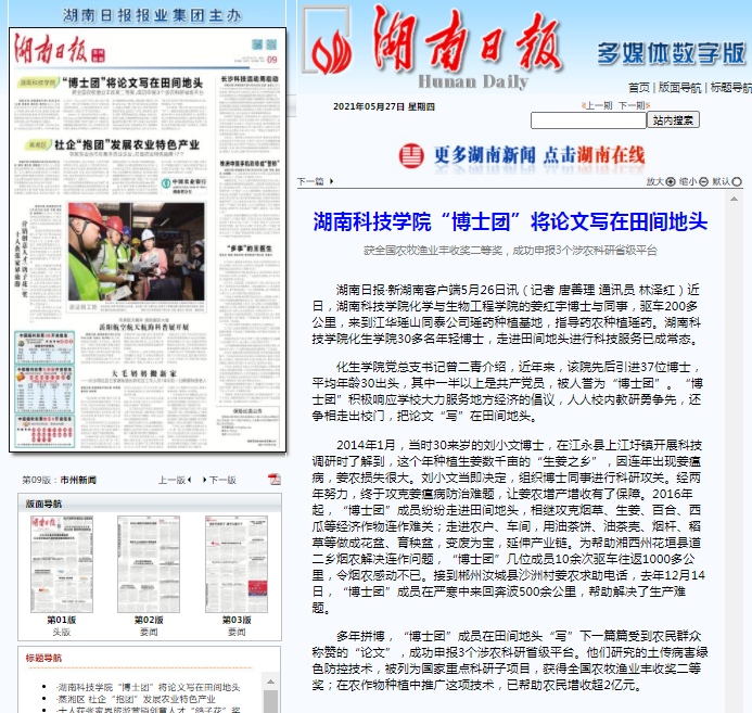 化生学院党总支书记曾二青介绍,近年来,该院先后引进37位博士,平均年龄30出头,其中一半以上是共产党员,被人誉为“博士团”。“博士团”积极响应学校大力服务地方经济的倡议,人人校内教研勇争先,还争相走出校门,把论文“写”在田间地头。