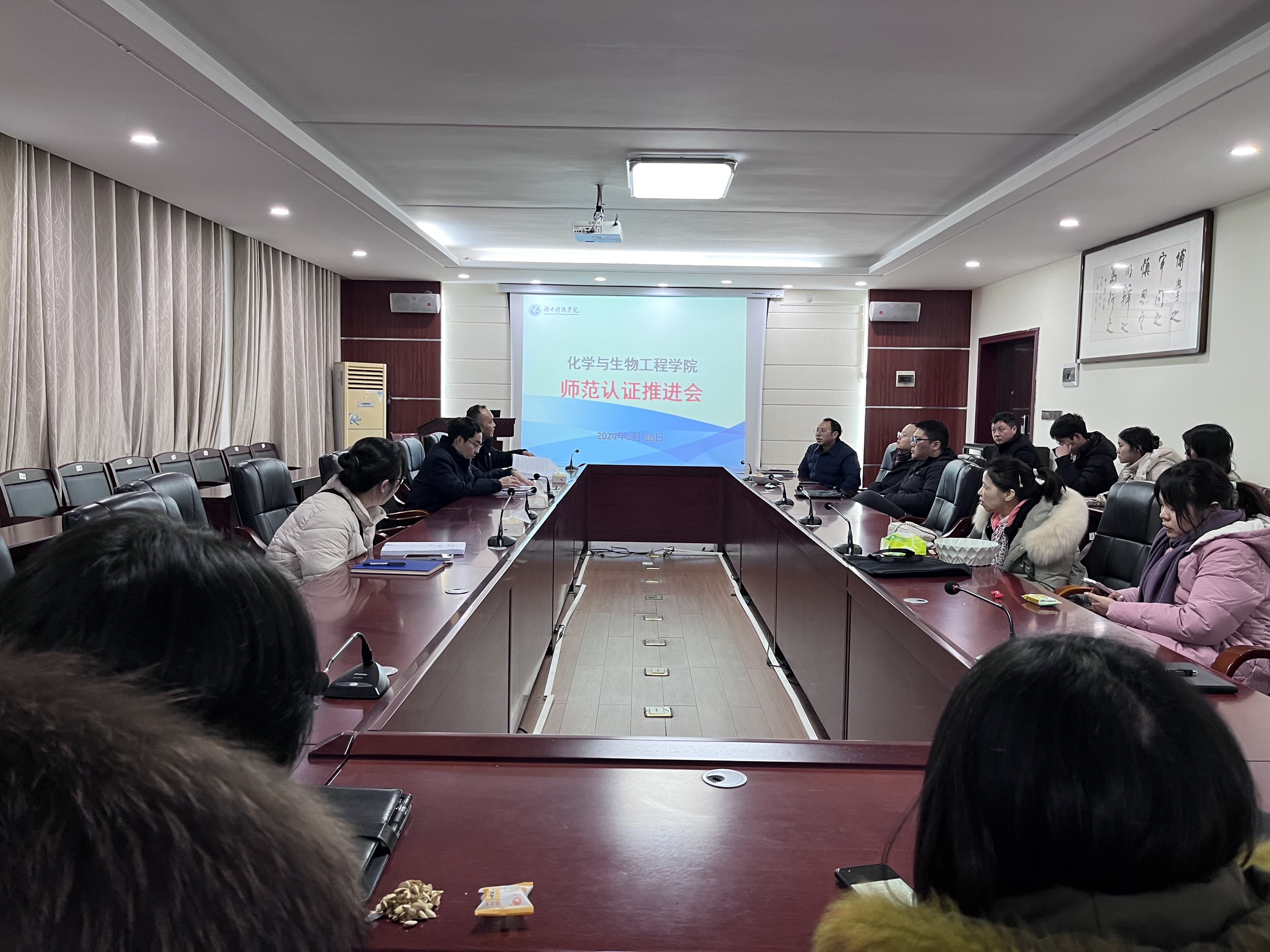 (本网讯 刘乐)为优化专业建设,提高人才培养质量,推进化学专业师范认证工作顺利开展,2月26日下午四点,学院于逸夫楼320组织召开师范生专业认证推进会。学院院长覃佐东,党总支书记曾二青,党总支副书记基艳,学院副院长唐武飞,各教学系主任,综合办、教务办主任及提供支撑材料的教师参加此次会议,会议由学院副院长肖新生主持。