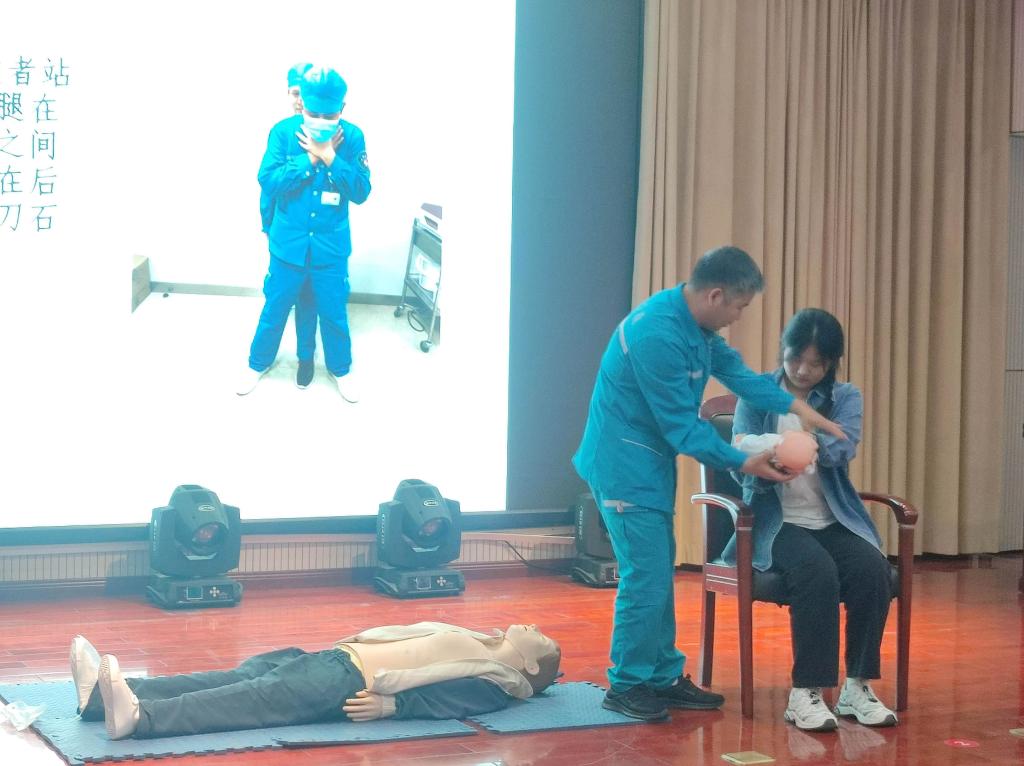 操作环节,医生现场进行示范演练。为了增强学生的现场参与感、即视感,讲座邀请了2名学生代表参与现场施救演练,医生在一旁逐一解答指导。同学们在仿真人体上演了心肺复苏技能和海姆立克急救法的实践练习。现场教学、亲身实践,给同学们留下深刻的印象,也更好的掌握了急救技能。