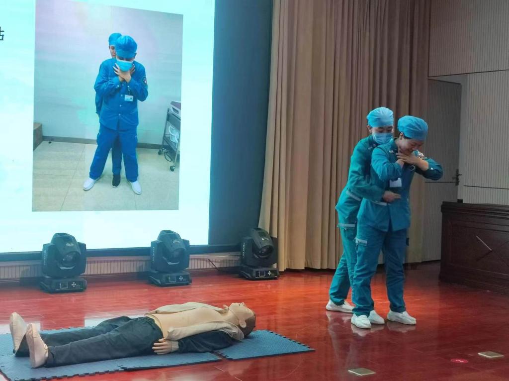 讲座伊始,李亚莉医生图文并茂、深入浅出的向同学们讲解了“海姆立克急救法”,通过“剪刀、石头、布”形象精要概括了“海姆立克急救法”的操作关键步骤。“剪刀”:将手指放于腹部正中线脐上。“石头”:一手握空心拳,拇指紧贴腹部正中线脐上两横指处。“布”:右手包裹住左手。三步有效、迅速操作,实现对器官、咽部异物驱除。学生对李医生的精彩的讲解,报以阵阵掌声。而后,李亚莉医生向同学们讲解了“心肺复苏”操作精要,通过急救医生登台实操示范、李医生现场讲解,直观、全景式的在线“心肺复苏”急救场景,全体同学“紧张”、认真的聆听讲座全程。