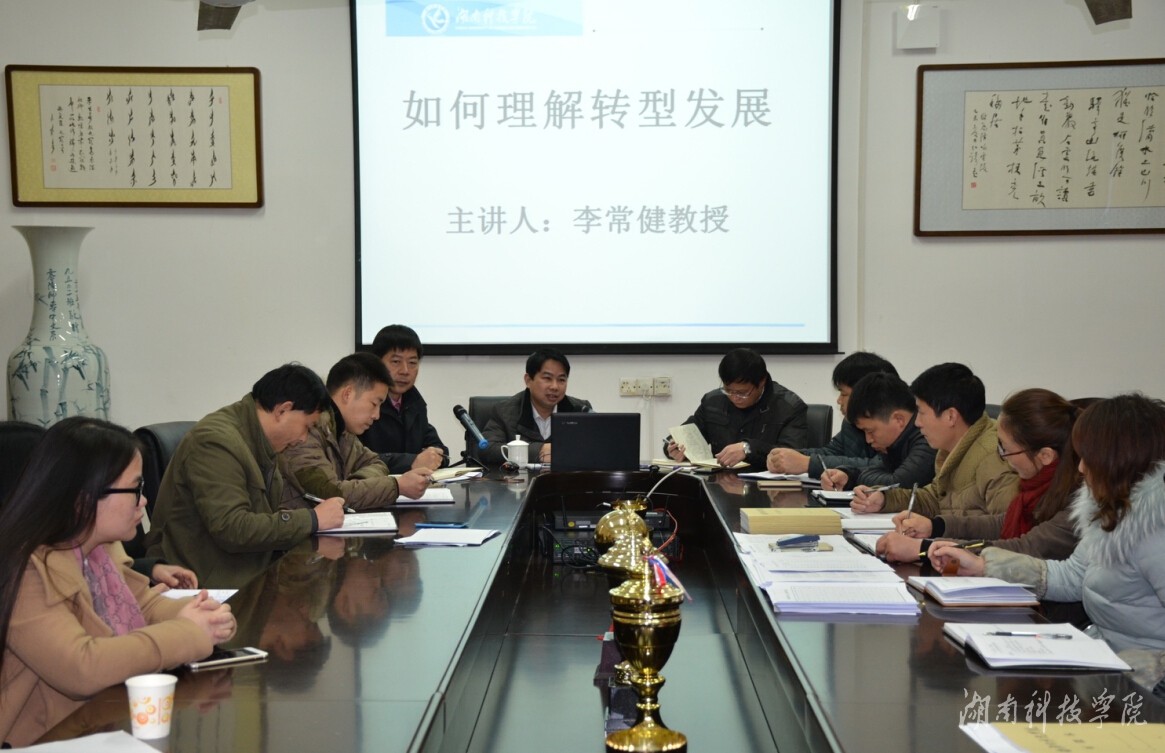 本网讯(通讯员 熊焕颖)2月24日上午,校党委委员、副校长李常健教授应邀在明德楼203会议室作题为“如何理解转型发展”的讲座。讲座由该院党总支书记杨能山主持,院长潘雁飞等学院领导以及全体教师参加。