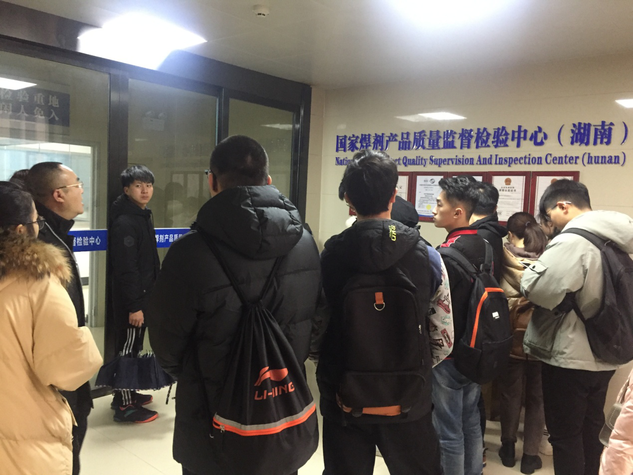 师生们首先参观了永州市商品质量监督检验所的国家CNAS认证实验室,该实验室主任鲁赤姣向大家详细介绍了检验所的检测项目、检测仪器的情况,并带领大家参观实验室。在国家焊剂产品质量监督检验中心(湖南),公司相关负责人为师生介绍了国检中心的发展历程和业务范围,带领师生参观了国检中心特色产品展厅,重点了解并参观了埋弧焊剂产品的检测和应用。