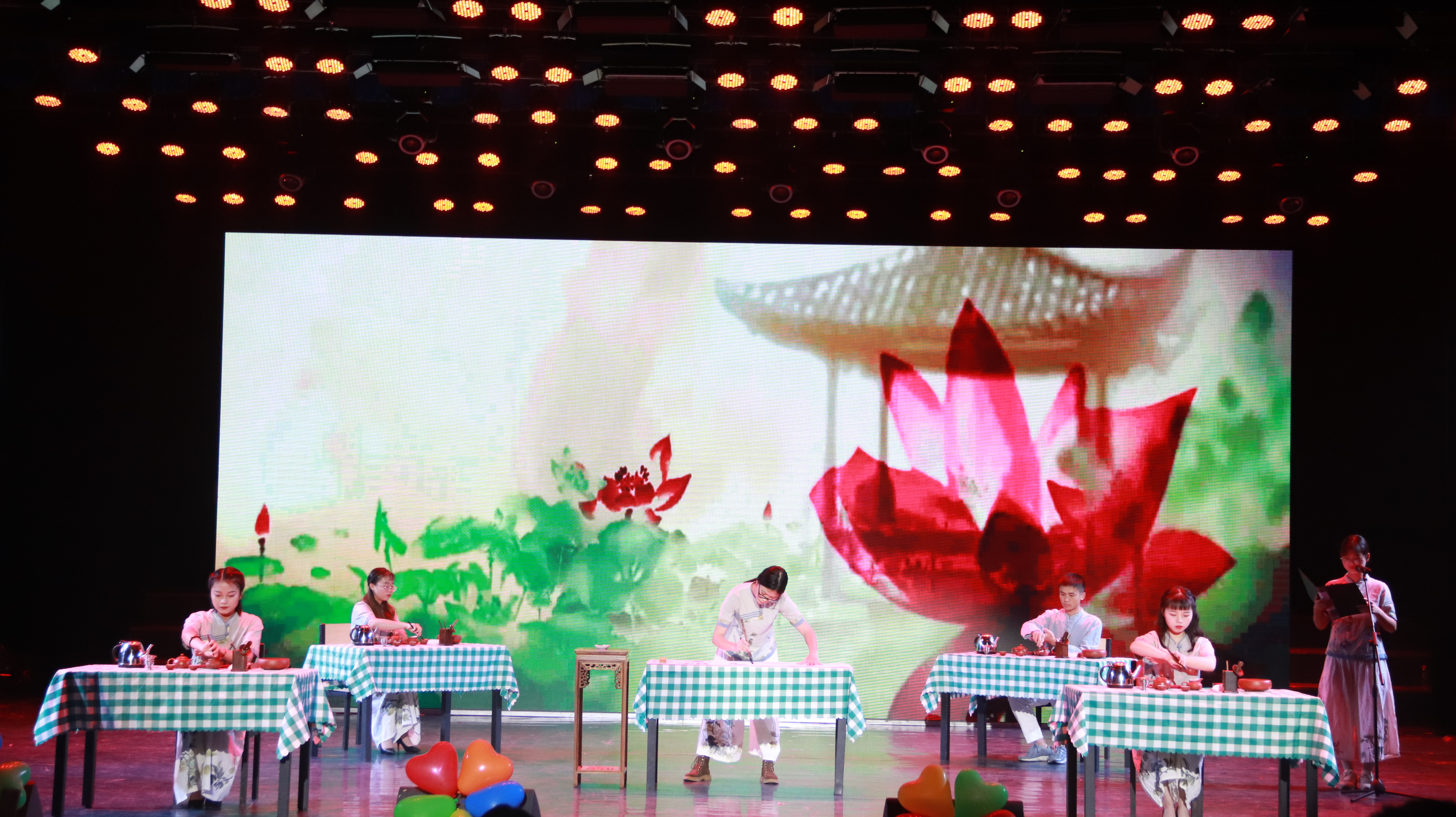 本次晚会以宿舍为表演单位,共有歌曲、舞蹈、诗朗诵等9个精彩节目。其中,松四610胡迪凡带来的独唱《给科院人的情书》唱响了晚会主旋律;桃一A623、松五417寝室成员们带来的茶艺表演,让大家感受到了中华传统茶文化的魅力;桃六B604和桃一B305寝室成员们带来的诗歌朗诵《祖国或以梦为马》,饱满深情,引起了现场的热烈反响;桃七A605仝勋飞带来的歌舞《嫦娥奔月》则将晚会推向了高潮。