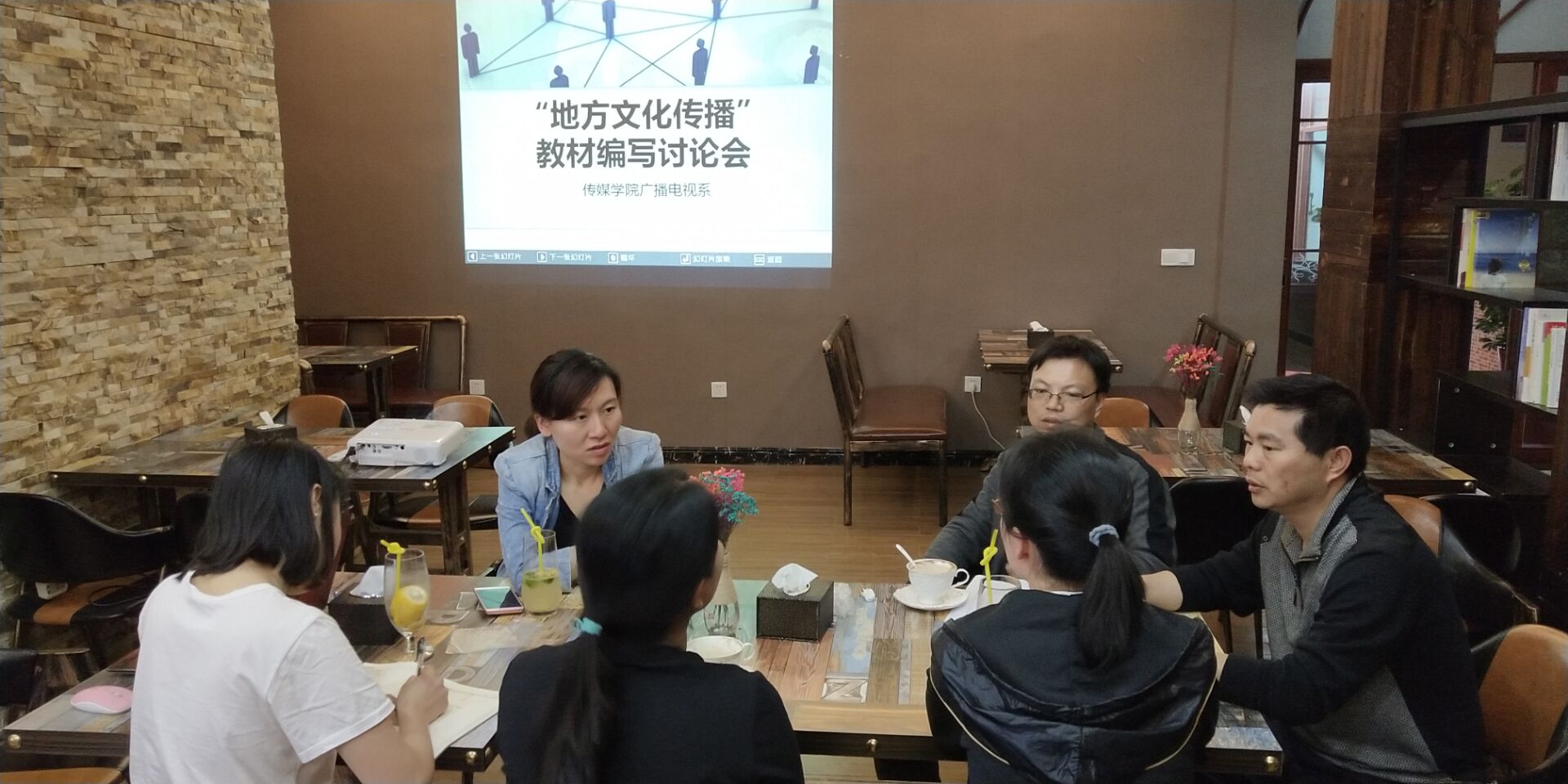 在咖啡屋内,气氛轻松活跃,老师们一边喝着飘着浓香的手磨咖啡、清爽宜人的果汁饮料,一边讨论教材编写事宜。大家就地方文化传播教材的定位、章节内容、参考文献、格式规范、任务安排、资料来源、典型案例等问题进行了讨论,并根据自己的专业提出了建议。通过充分讨论,最终形成了初步统一的意见。