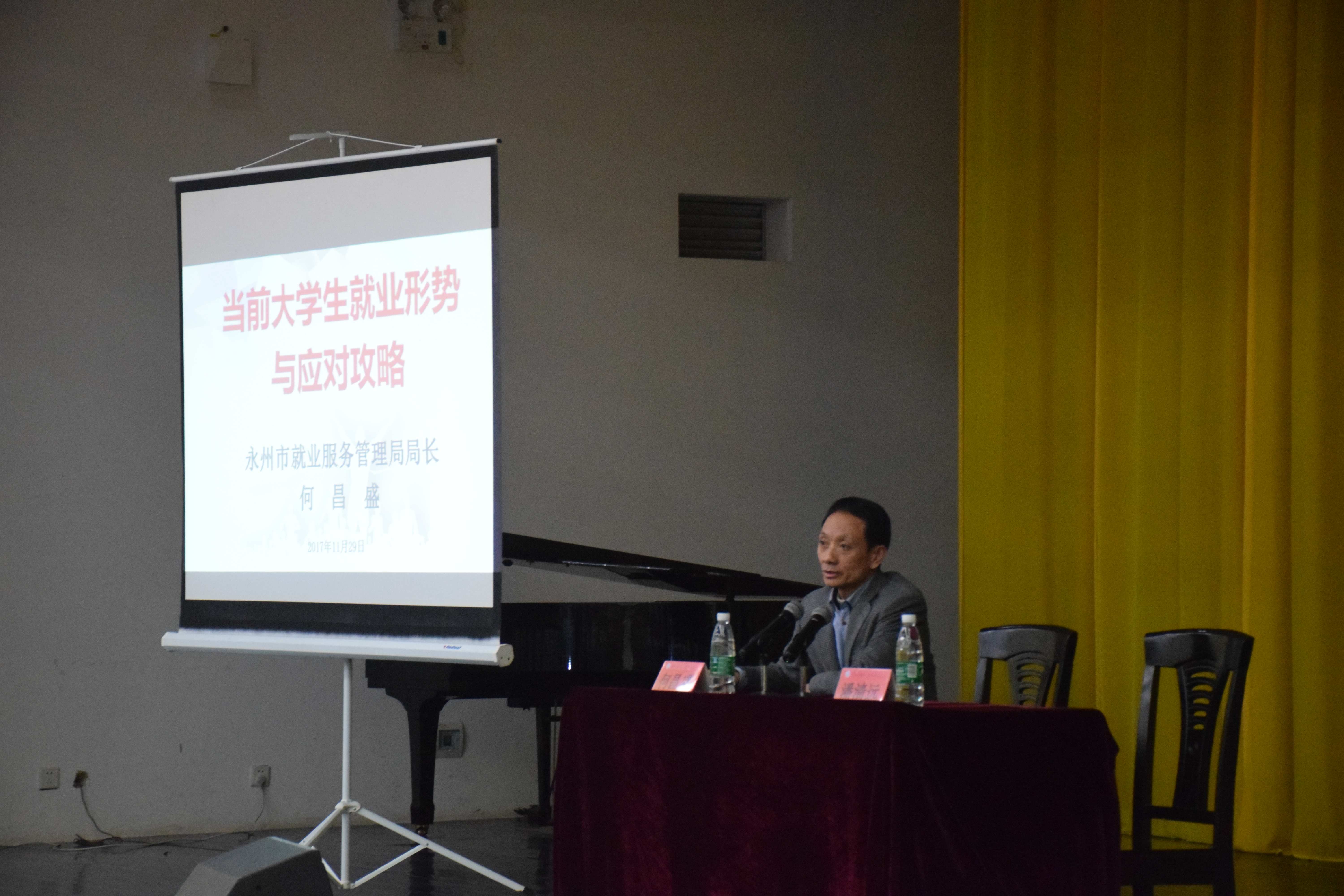 本网讯 11月29日晚,永州市就业服务管理局局长何昌盛应邀来校作《当前大学生就业形势与应对攻略》讲座。传媒学院、人文与社会科学院近300名师生聆听了本次讲座,传媒学院党总支副书记潘清远主持讲座。