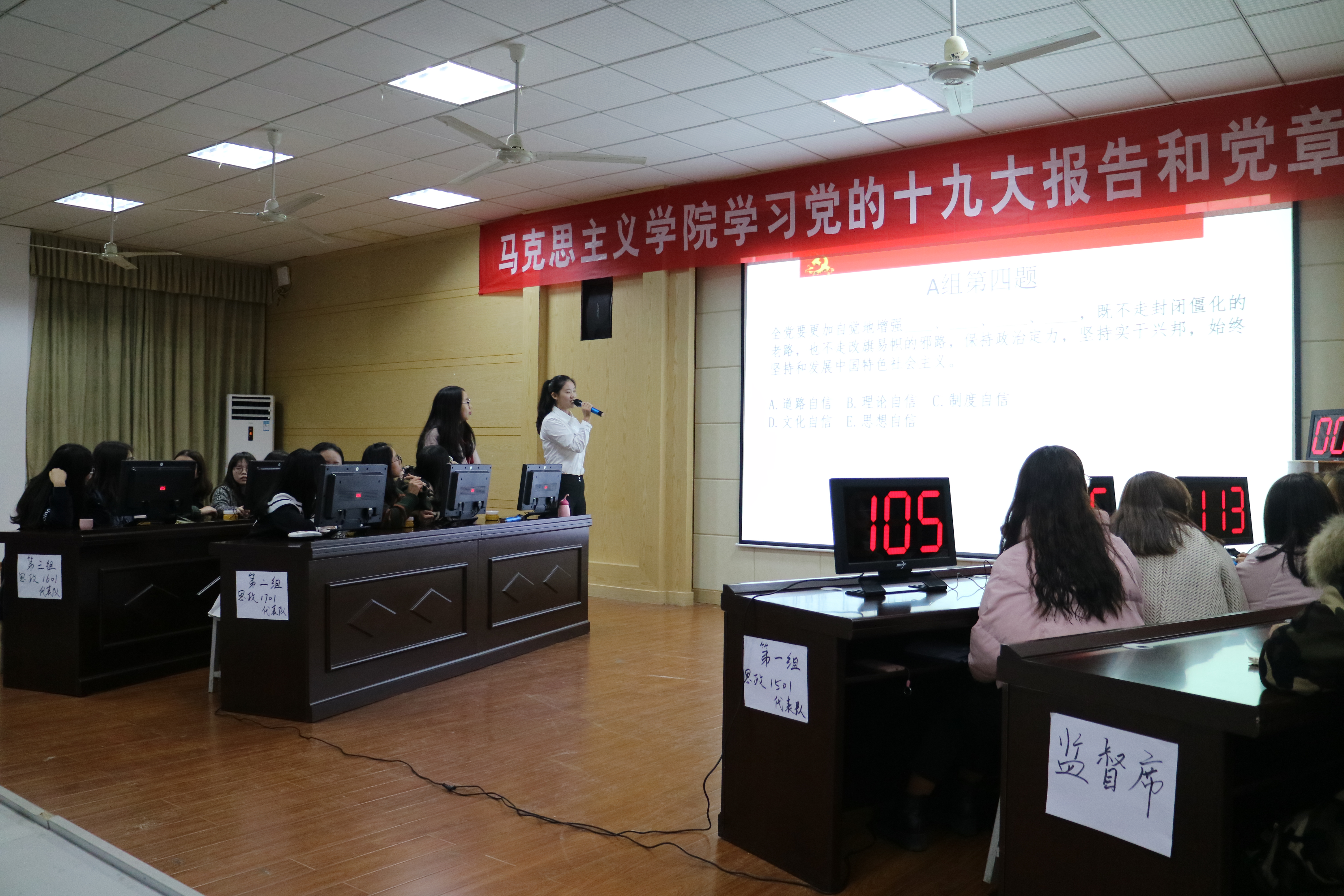 本次知识竞赛设置必答、选答和抢答三个环节。竞赛有三支参赛队伍,每个参赛队伍由五名同学组成。必答环节中选手们充分展现个人的能力,应答自如;选答环节中同学们摩拳擦掌,挑战风险;在抢答环节中,选手们争先恐后地抢答题目,耳聪手快、思维敏捷,思政1501班李艳同学以数次“快抢快答”赢得观众阵阵掌声。经过紧张激烈的比赛,思政1501班代表队荣获一等奖,思政1701班代表队获二等奖,思政1601班代表队获三等奖。