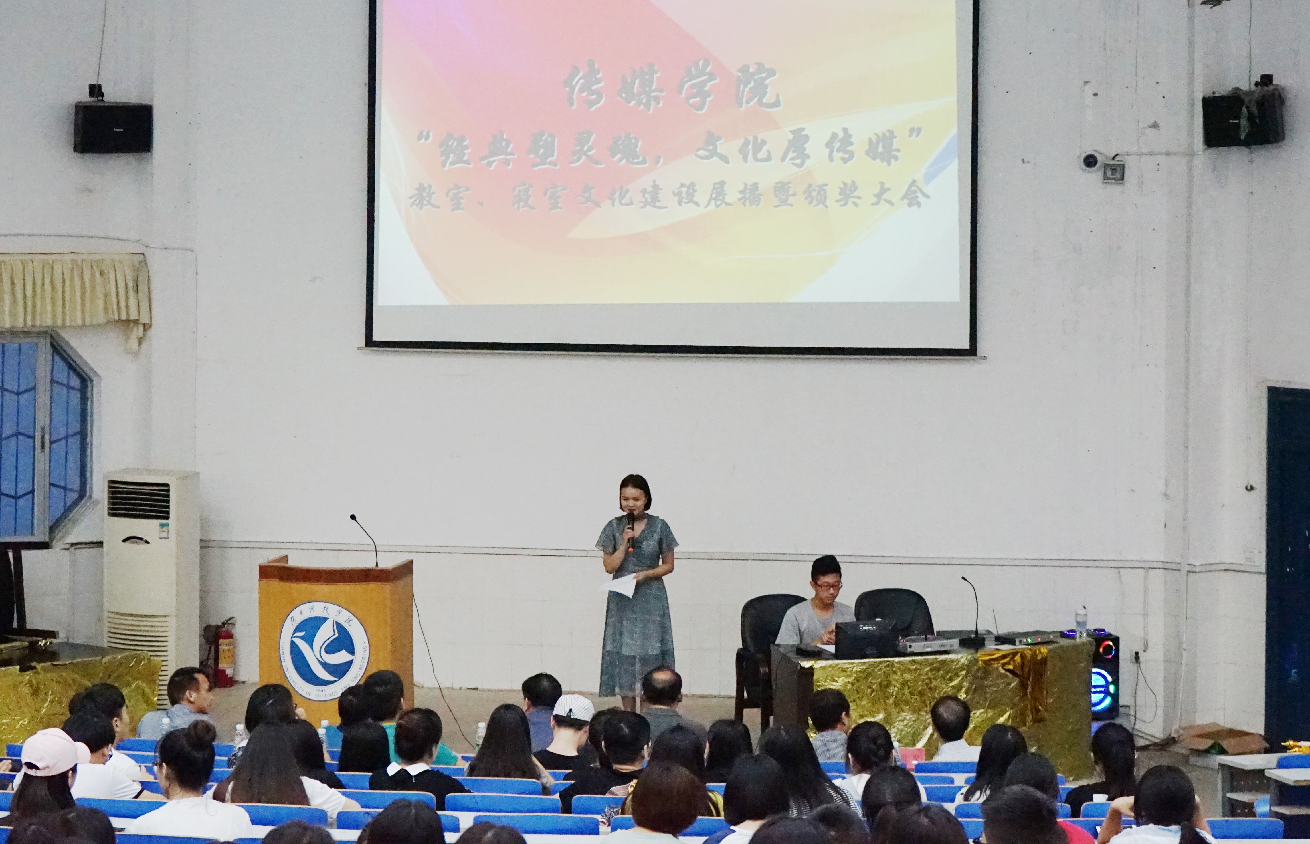 本网讯 6月26日晚,传媒学院“经典塑灵魂,文化厚传媒”教室寝室文化建设展播暨颁奖仪式在日新楼举行。学工部部长唐华山、校团委副书记刘佳以及传媒学院全体领导出席仪式。