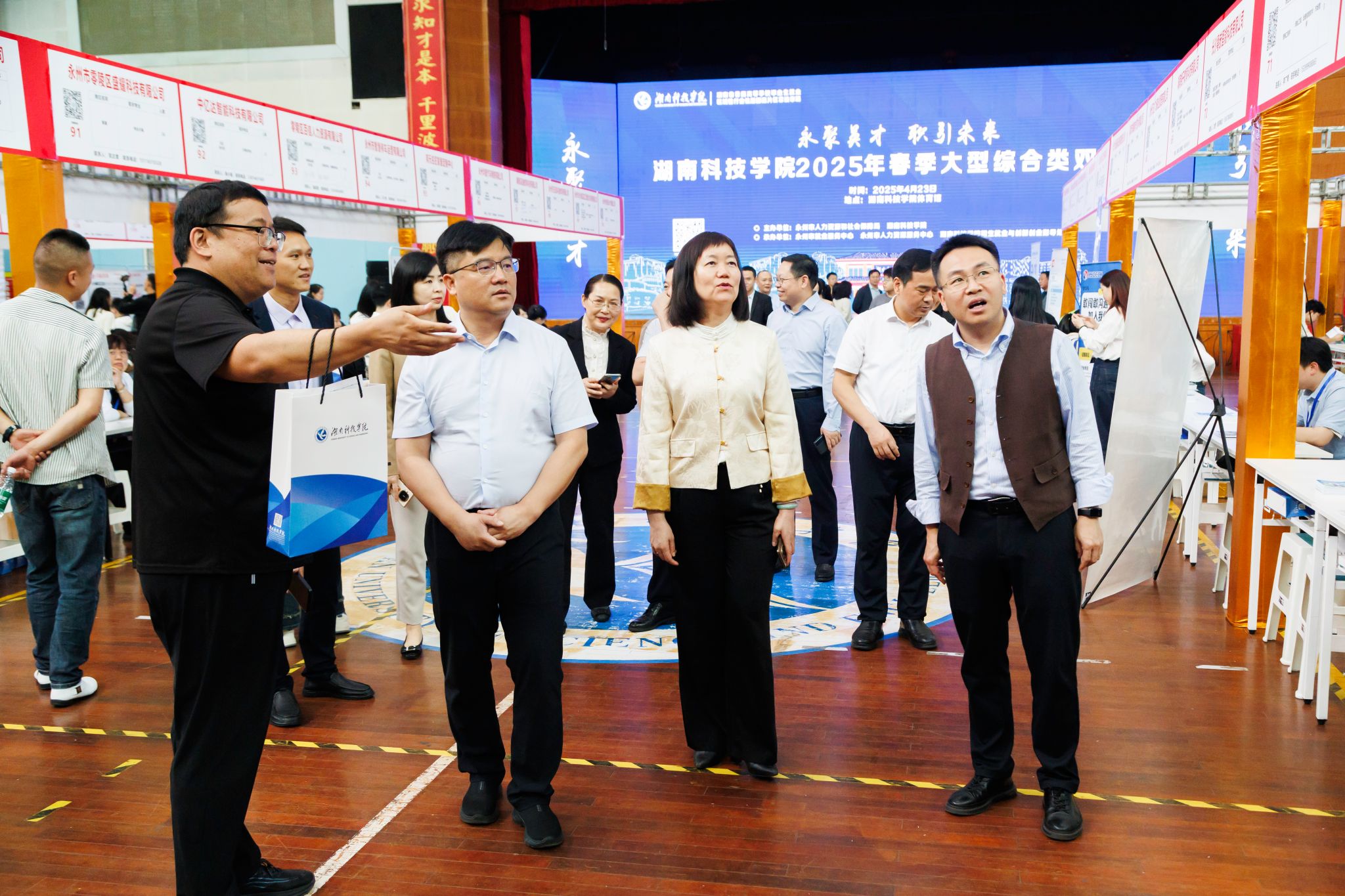 为深入贯彻落实国家稳就业政策,搭建优质“政校企对接平台”,4月23日上午,中共vwin德赢ac米兰官方网机关第十二党支部联合国家税务总局永州市税务局参加由vwin德赢承办的“2025年春季大型综合类双选会”。活动以“永聚英才、职引未来”为主题,吸引了全市180多家用人单位及4276名应届大专院校的毕业生。校党委书记李钢,党委副书记、校长黄创霞,副校长郑银芳,永州市人力资源和社会保障局党组书记、局长、一级调研员骆方方,永州市人力资源和社会保障局副局长陈巍出席双选会。
