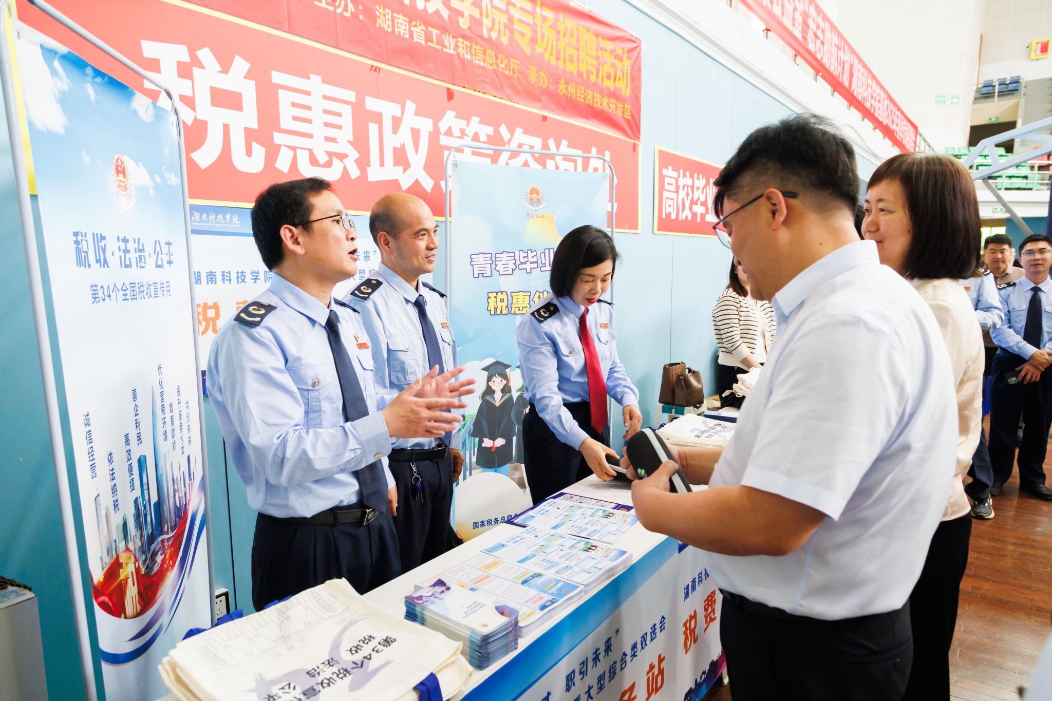 本次双选会突破传统模式,联合税务部门作为“特殊展位”入驻。永州市税务局现场设立政策咨询专区,围绕大学生就业创业税收优惠政策、社保缴纳流程、个人所得税申报等热点问题展开“一对一”讲解,并通过发放手册、案例指导、有奖竞猜等形式,帮助毕业生算清“就业经济账”,确保高校毕业生“求职有门、就业有路、困难有助”。