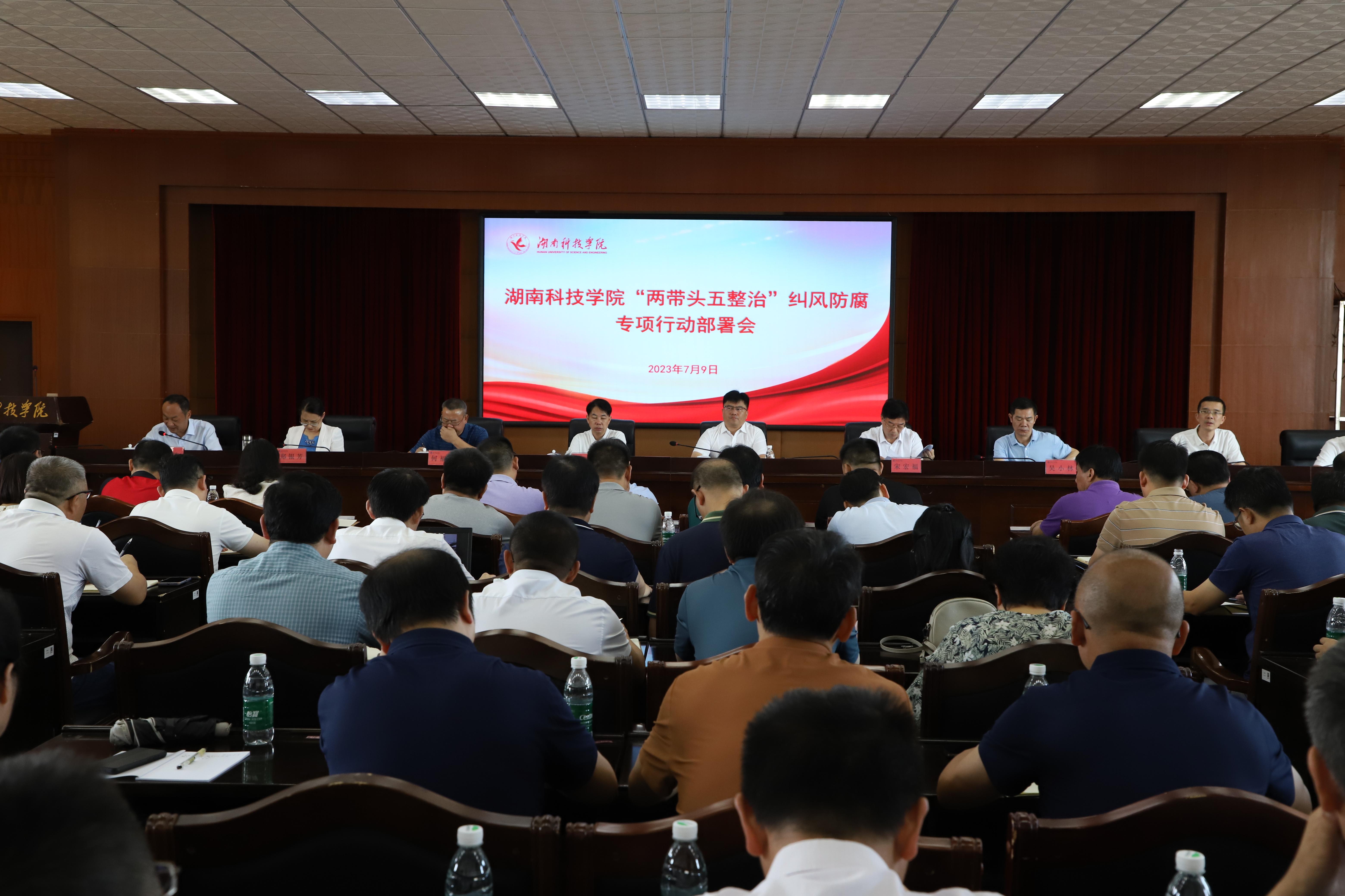 本网讯7月9日,学校召开专题会议部署“两带头五整治”纠风防腐专项行动工作,全体校领导、党委委员出席会议,中层干部参加会议。