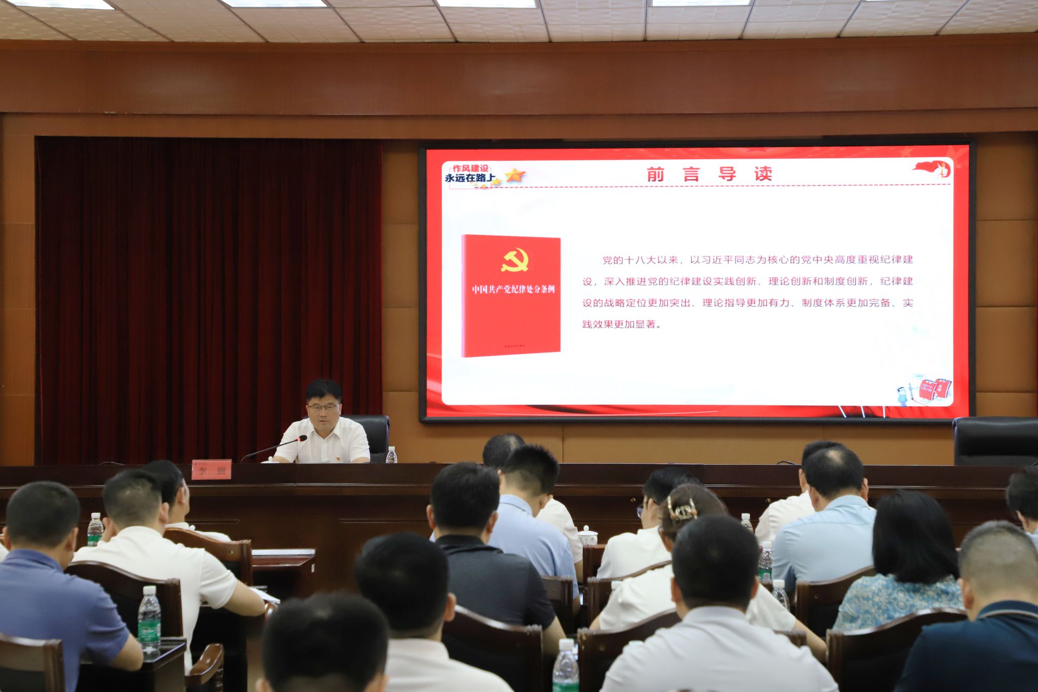 李钢以《严守“六大纪律” 筑牢思想根基》为题讲授专题辅导报告,他围绕党的政治纪律、组织纪律、廉洁纪律、群众纪律、工作纪律、生活纪律等六大纪律,深入解读了六大纪律的负面清单,并引用了大量教育领域违反党纪党规的典型案例,深入剖析了违反党纪的危害与后果。他对全体中层干部提出三点要求:一是严格对标对表,坚决守住底线。要准确把握《中国共产党纪律处分条例》的主旨要义和规定要求,始终把纪律和规矩挺在前面,真正知纪于心、履纪于行、守纪于常;二是突出问题导向,时刻自重自省。要根据各单位及个人实际,对照负面清单,深入开展风险点自查,把“六项纪律”融入日常、抓在经常、落在平常;三是着力提升境界,促进学校发展。要把纪律规矩转化为政治自觉、思想自觉、行动自觉,切实增强政治定力、纪律定力、道德定力、抵腐定力,推动党纪学习教育学在深处、落在细处,努力把党纪学习教育成效转化为推动学校高质量发展的强大动力。