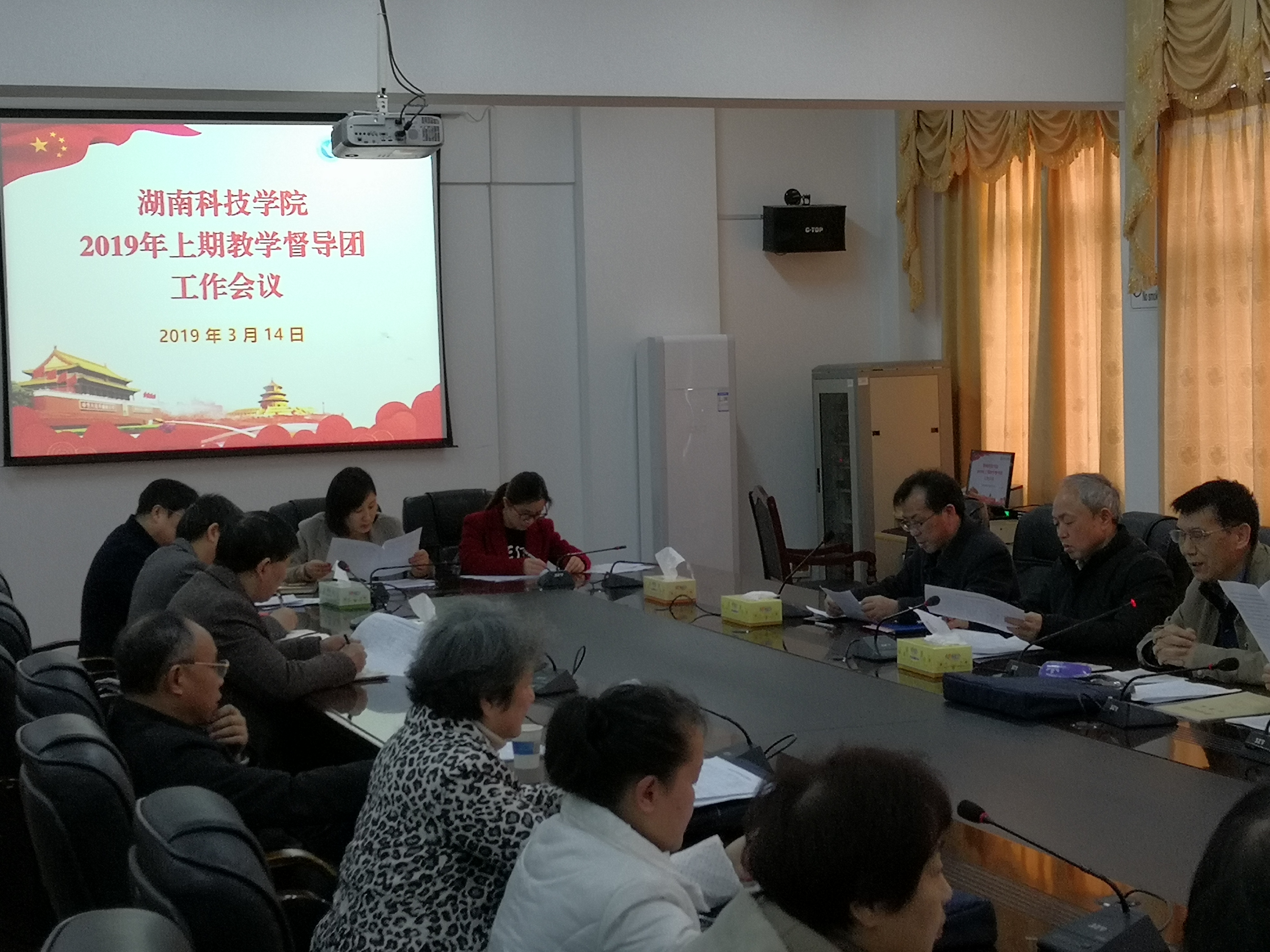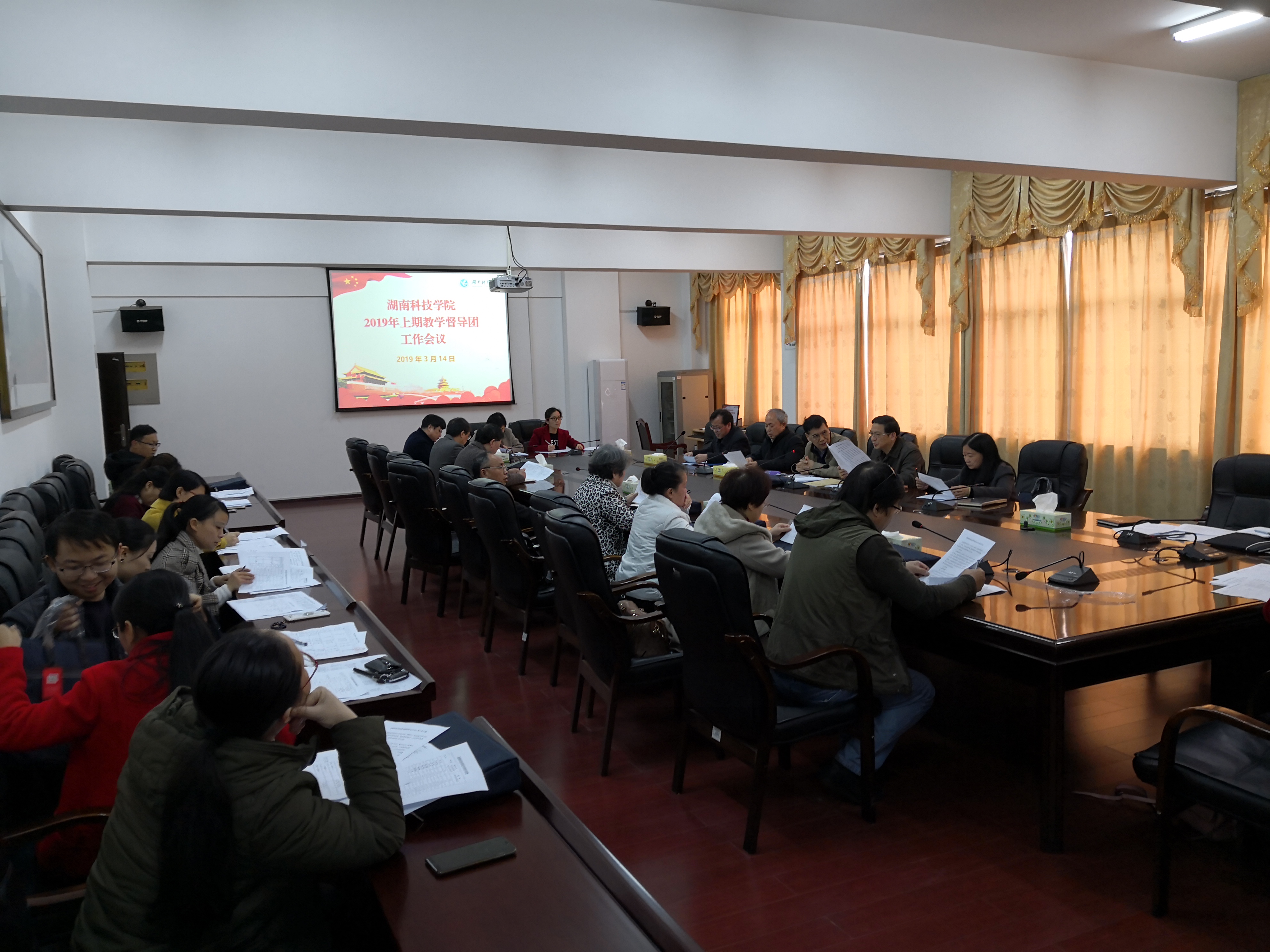 本网讯 3月14日下午,学校召开2019年上期校教学督导团工作会议。教务处、教学质量管理处、实验实训中心、教师教育学院等部门负责人参加会议,会议由教学质量管理处处长聂志成主持,教学督导团、教学质量管理处全体成员出席。