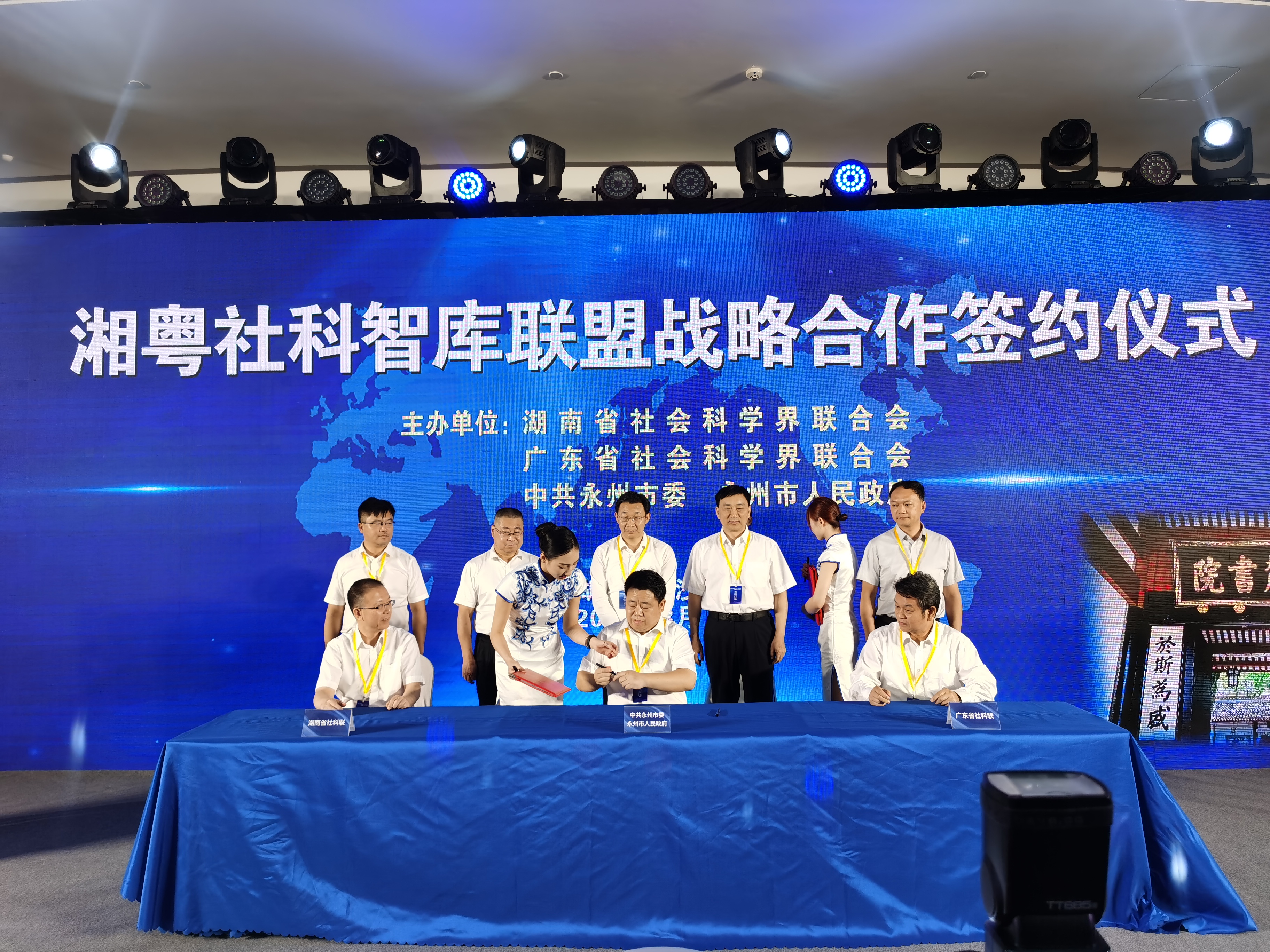 活动现场,湖南省社科联、广东省社科联、永州市委市政府举行《湘粤社科智库联盟战略合作协议》签约仪式。作为智库联盟挂牌单位,校长李钢与其他与会领导共同见证签约。
