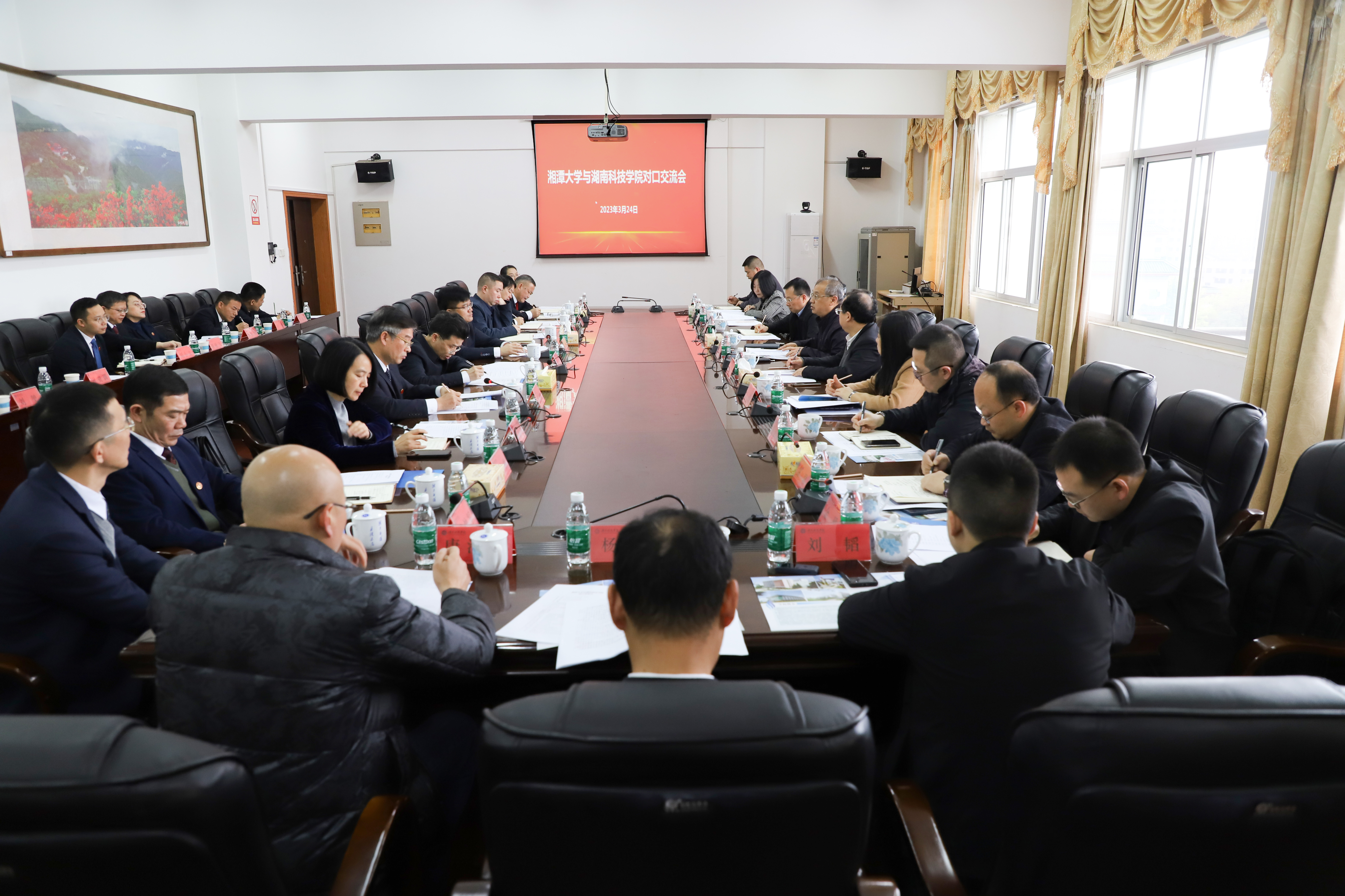 本网讯 3月24日,湘潭大学与vwin德赢ac米兰官方网开展2023年对口支援合作交流座谈会。湖南省政协副主席、民进湖南省委会主委、湘潭大学校长潘碧灵,湘潭大学党委委员、副校长刘建平,永州市政协党组成员、副主席蒋井泉,永州市教育局局长黄赞校,民进永州市委会主委、零陵区副区长陈丽萍,vwin德赢党委副书记、校长李钢,校领导宋宏福、李常健、吴小林、何福林、陈灿军、郑银芳,党委委员、组织部部长杨涛出席会议。会议由党委副书记宋宏福主持。