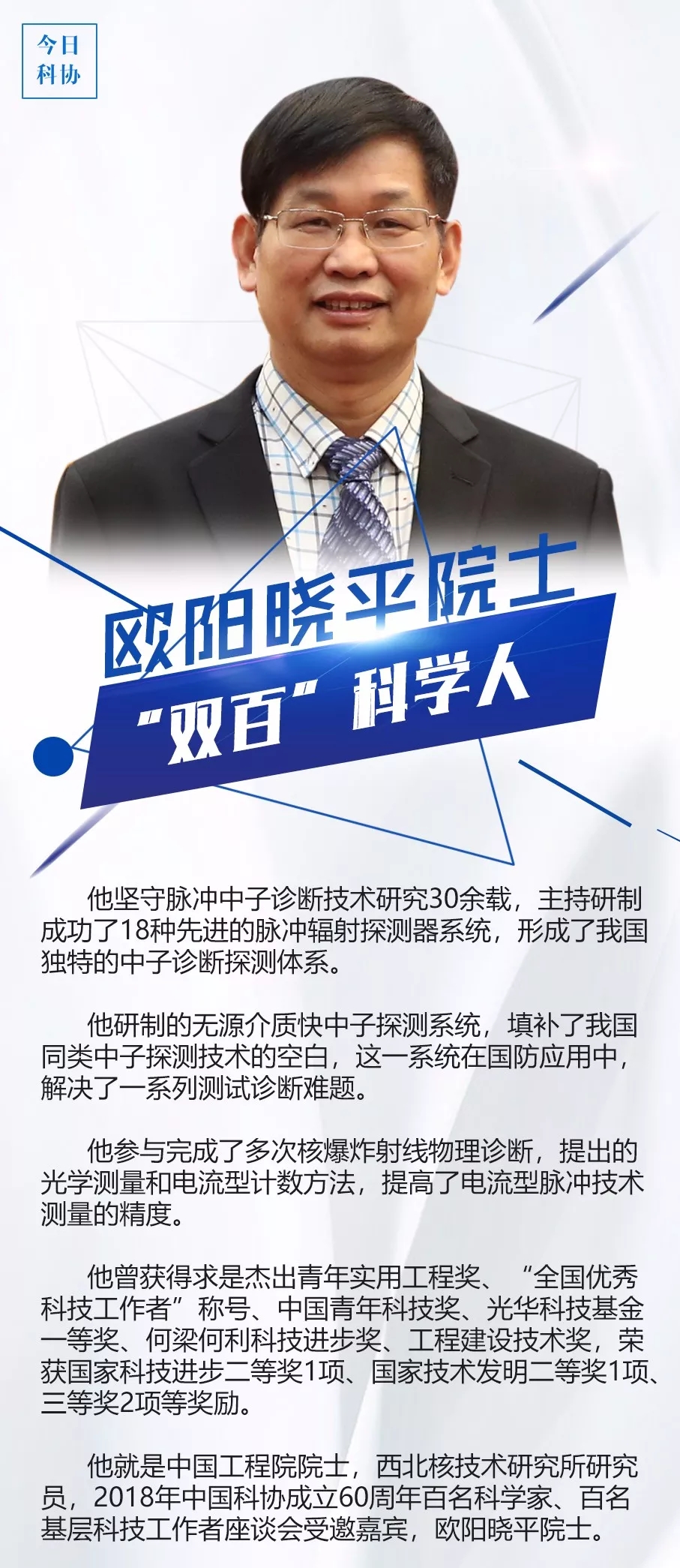 本网讯 近日,《今日科协》策划推出《图说“双百”科学人》栏目,推介一批受邀参加中国科协成立60周年百名科学家、百名基层科技工作者座谈会的“双百”科学人。该栏目以《欧阳晓平院士:坚守脉冲中子诊断技术研究30余载》为题,对vwin德赢名誉校长、杰出校友、中国工程院院士欧阳晓平进行了推介报道,现将全文予以转载。