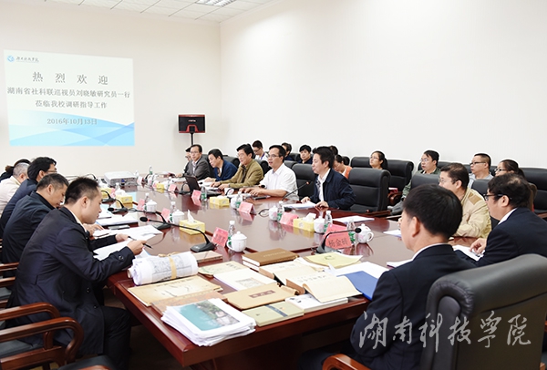 10月13日上午,湖南省社科联巡视员刘晓敏研究员一行来校调研。校党委书记陈弘主持,校长曾宝成,副校长宋宏福,副校级督导、工会主席陈仲庚出席。