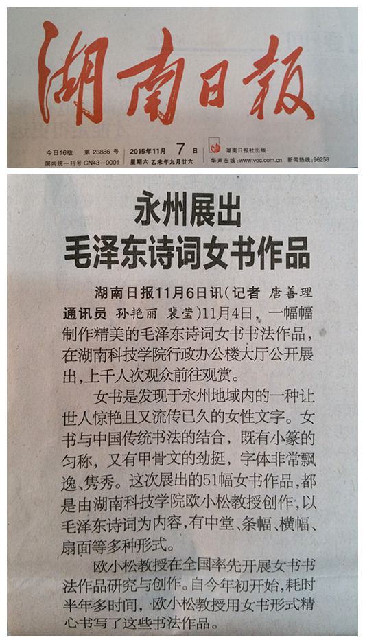 湖南日报:永州展出毛泽东诗词女书作品