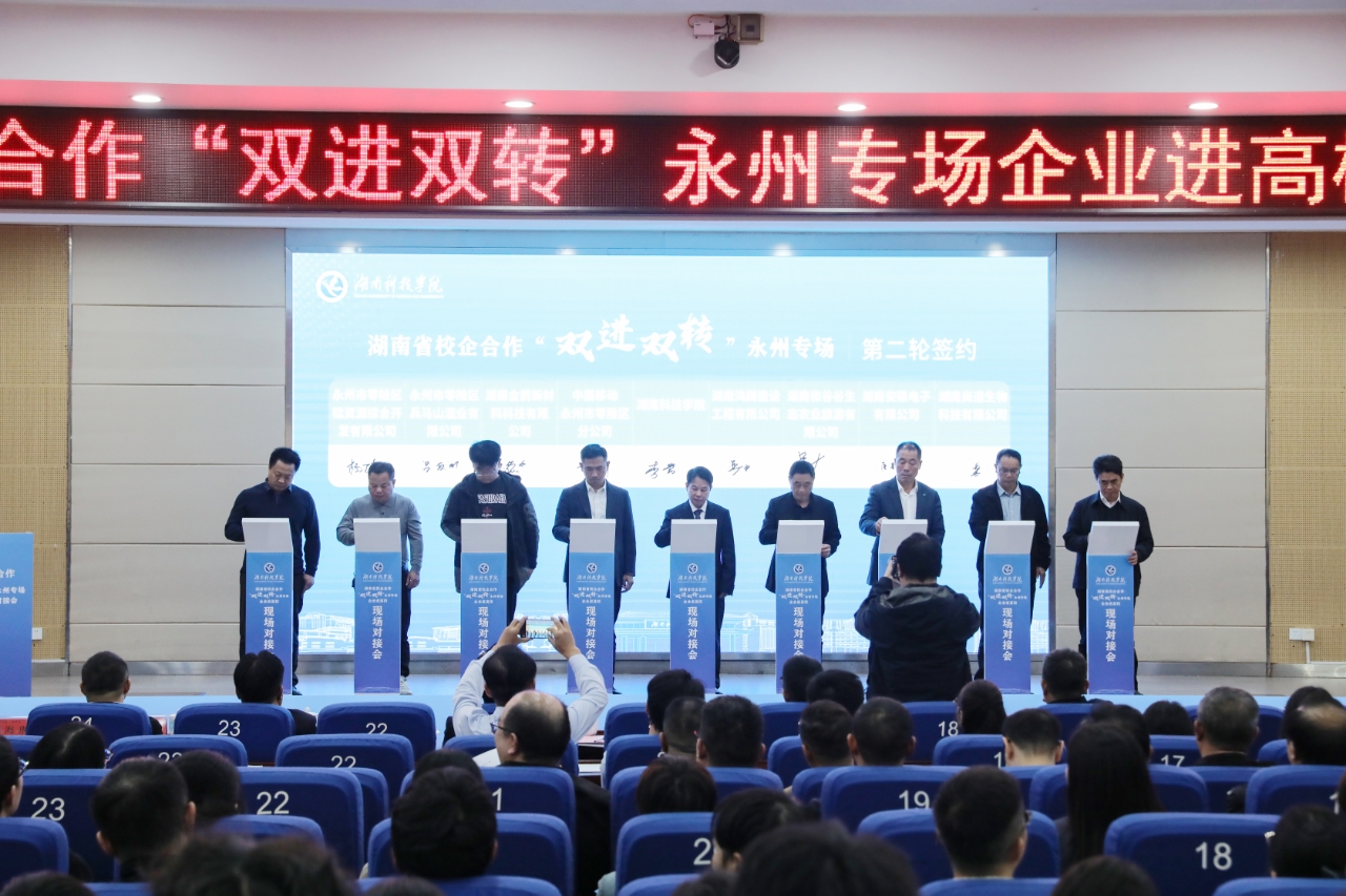 对接会现场,“粘土矿物资源高值转化与功能阻燃材料集成技术”等3个专家团队推介了科技成果,“菌临智境——食用菌智能化产业引领者”等2个大学生团队介绍了创新创业成果,学校与湖南中稀环保科技有限公司、湖南时代阳光药业股份有限公司等16家企事业单位签订产学研合作协议。