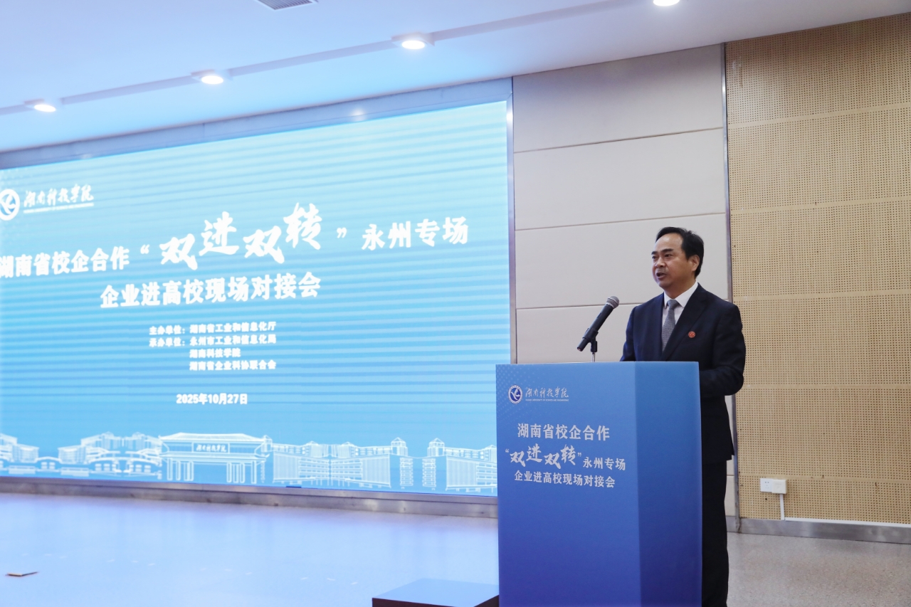 本网讯(记者 向薛峰 摄影 谢志豪)10月27日,2025年湖南省校企合作“双进双转”永州专场企业进高校现场对接活动在vwin德赢举行,这是继湖南大学、中南大学之后,校企合作“双进双转”第3场企业走进高校活动。湖南省工信厅党组成员、副厅长毛六平,省委第十四巡视组组长林目轩,永州市政协副主席、市工信局局长方智毅,校党委书记李钢,党委副书记、校长黄创霞等领导出席活动。省市县相关单位、省企业科协联合会代表,专家和企业代表,vwin德赢科研团队和师生代表共300余人参加活动。