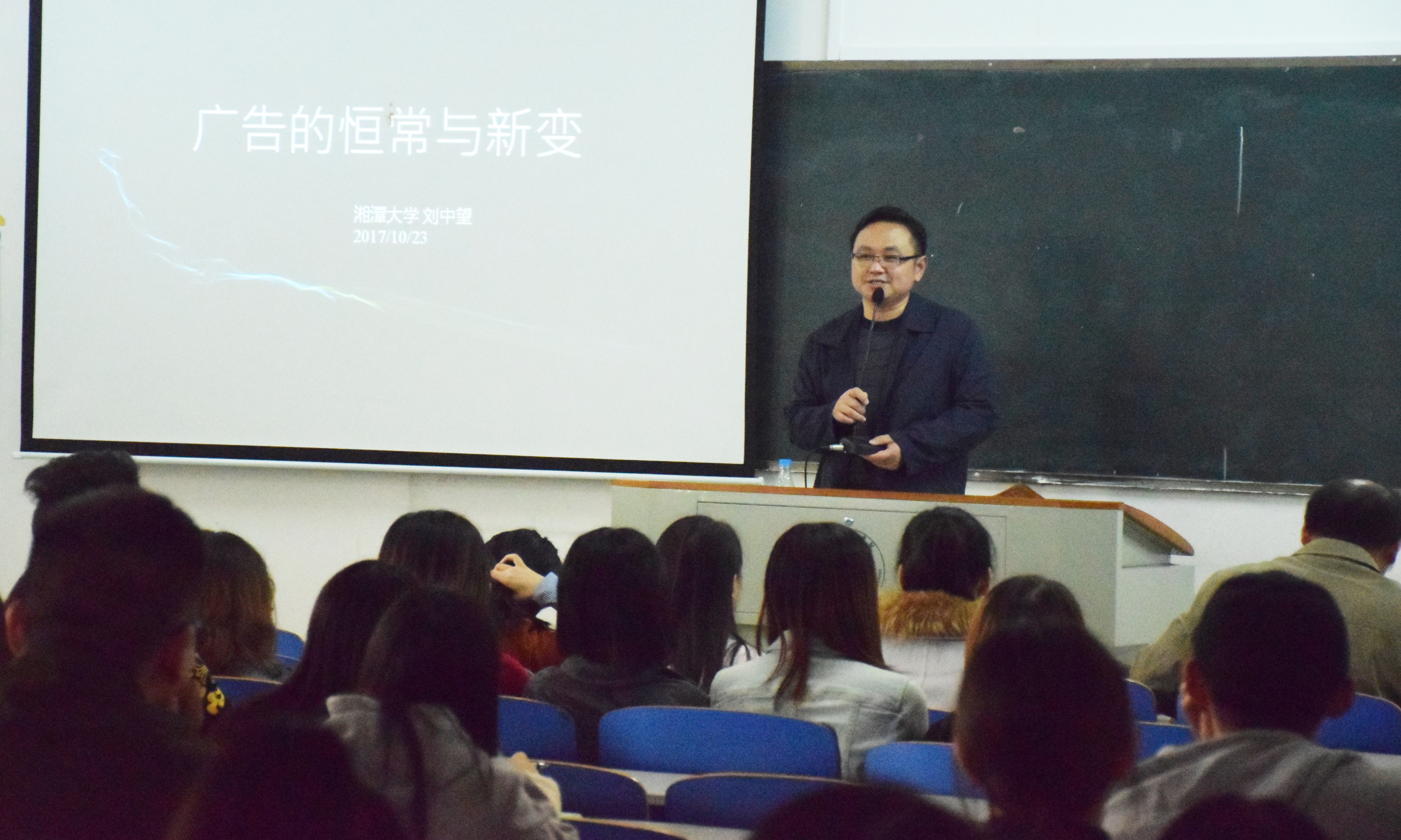 本网讯 10月22日,湘潭大学博士生导师刘中望教授应邀来vwin德赢为传媒学院师生作题为《广告与前沿》主题讲座,传媒学院广告专业师生聆听了讲座,传媒学院院长杨增和主持讲座。
