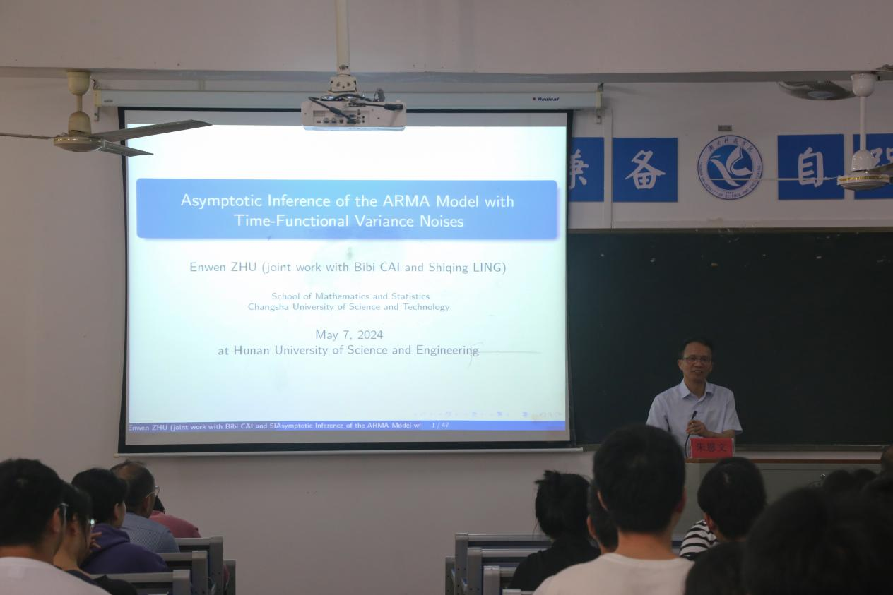 本网讯(通讯员:黄佳乐)57日下午理学院在明理楼302举行了以Asymptotic inference of the ARMA model with time-functional variance noises为主题的学术讲座,讲座由长沙理工大学数学与统计学院朱恩文教授主讲,理学院院长李小武主持