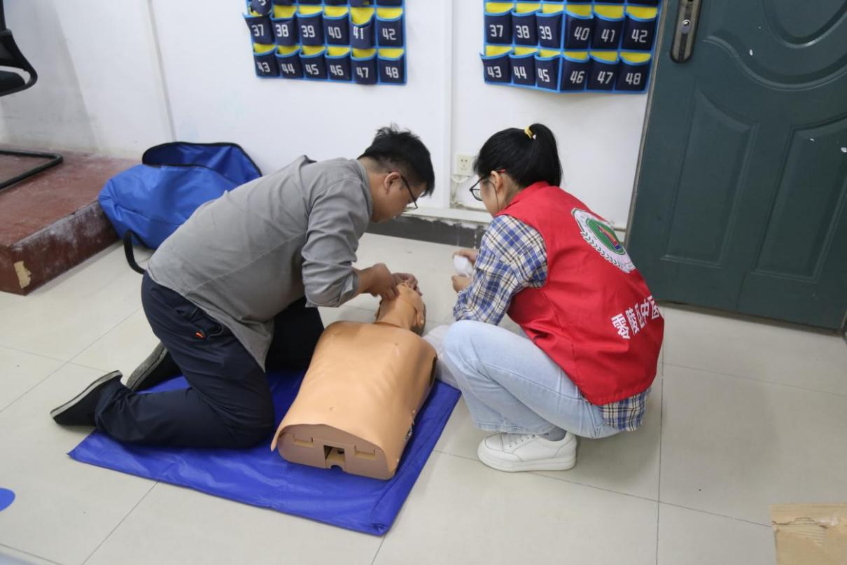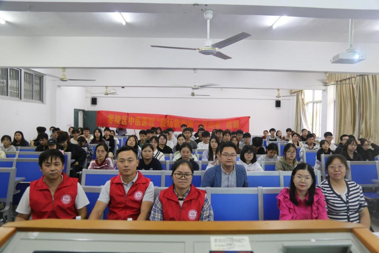 本次讲座由零陵区中医院导师为大学生们讲授应急救护知识。讲座主要分为两个部分:心肺复苏技巧以及创伤现场保护。心肺复苏可概括为30次胸外按压和2次人工呼吸为一次循环。除此之外,专家还普及了气道异物梗阻等生活中常见的紧急情况及应急措施。第二部分,讲师列举了各种常见创伤,如摔落伤等。且归纳了各类创伤的形成原因、特点及类型。讲座结束之后,专家组织同学们按照讲座上所讲述的急救步骤对假人进行实操。培训课程以理论加实践的形式圆满结束。