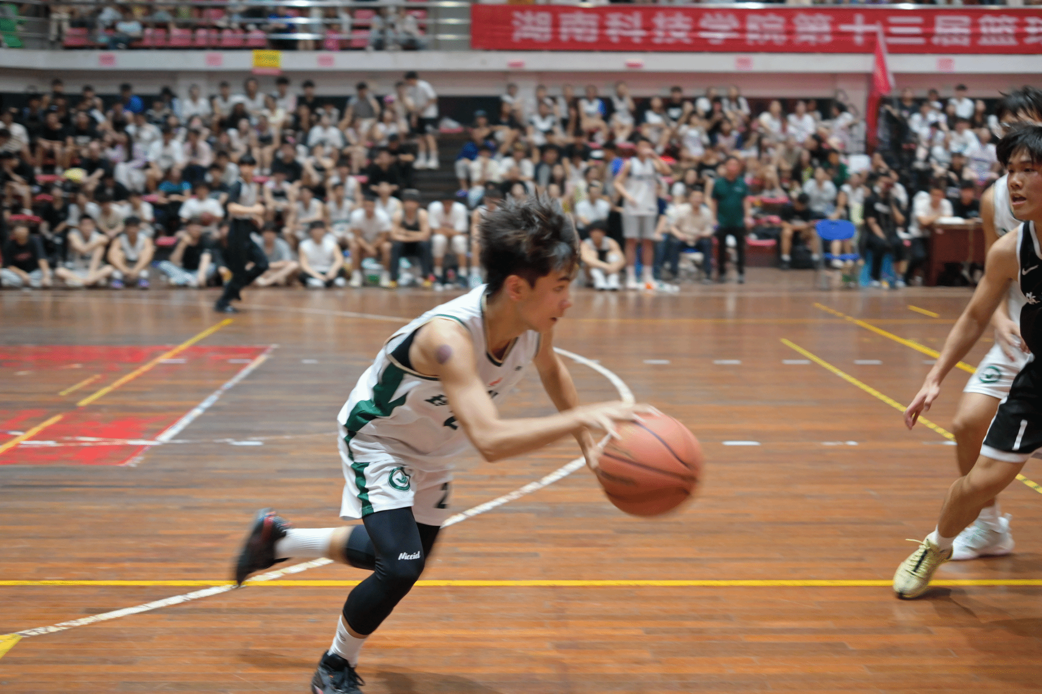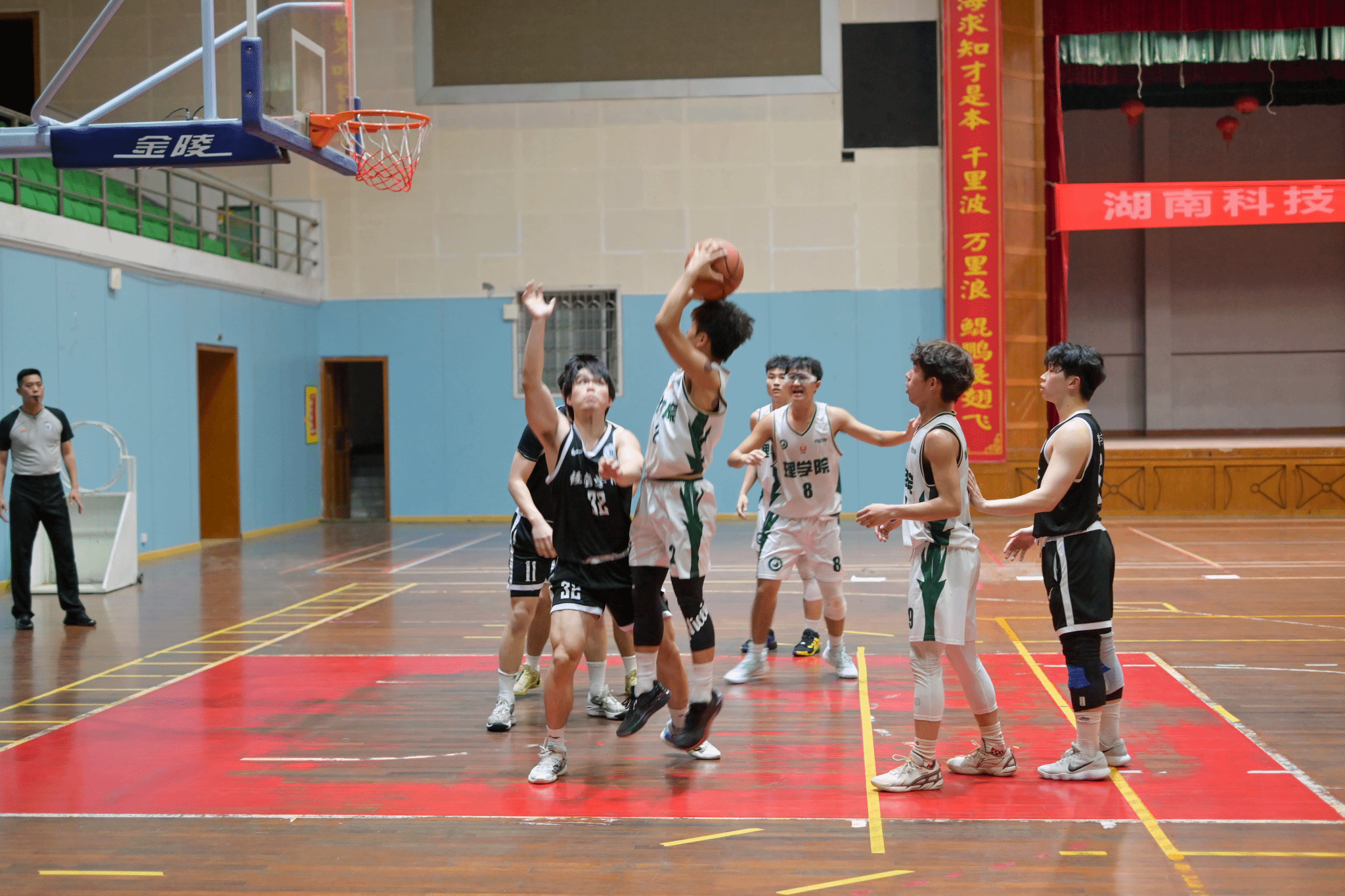比赛开始,身着白色队服的理学院篮球队在第一节利用高位对抗的优势,借助队友的掩护与挡拆次次突入内线,一次次外线精准投射,领先对面。接下来的第二、三节经济管理学院篮球队抓住理学院防线漏洞逐渐将比分拉回,并成功反超。赛场气氛焦灼,理学院篮球队员调整防守战略,在最后几分钟时间将比分追平。紧接着理学院篮球队控球后卫假动作晃过防守,抛投绝杀,反超比分。最后20秒时,理学院篮球队员罚球再次得分,最终以50:47的成绩取得胜利,全场沸腾!