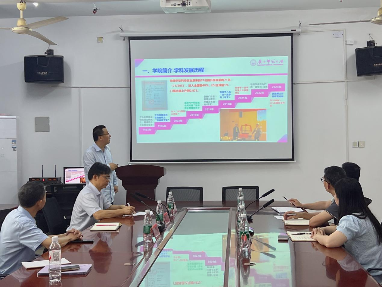本网讯(通讯员:刘静)为深入落实新时代人才选拔培养工作要求,充分发挥高校协同育人作用,进一步帮助22级考研学生做好考研规划,理学院于2025年5月14日上午在明理楼313会议室开展广西师范大学研究生招生宣讲会。广西师范大学杜亮教授、王海教授、高忠贵副教授,理学院副院长吴清华、党总支副书记欧阳素勤、理学院部分教师以及22级物理学专业部分学生参加了本次宣讲会。