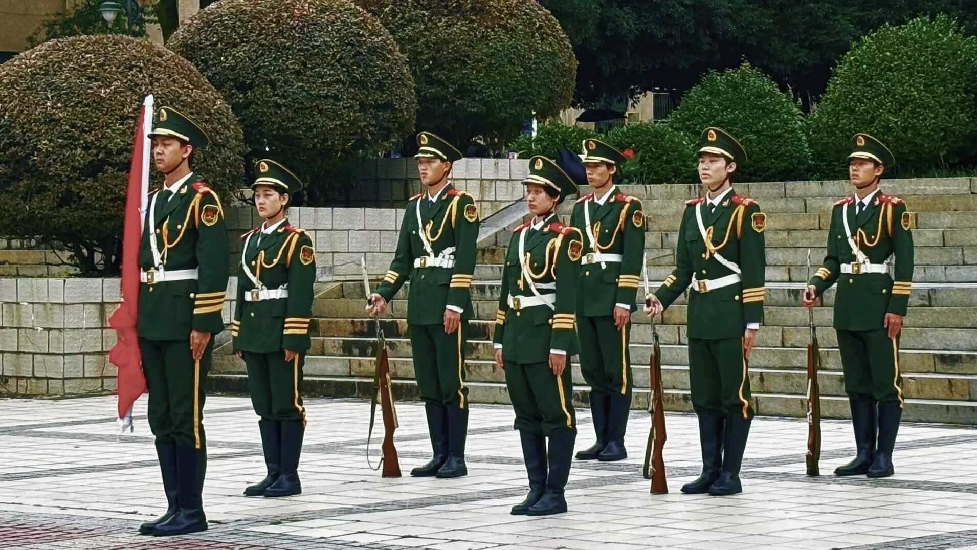 7点整,升旗仪式正式开始。国旗护卫队迈着整齐的步伐护送国旗入场,伴随着雄壮的国歌声,五星红旗冉冉升起,全体师生肃立行注目礼,现场气氛庄严肃穆。