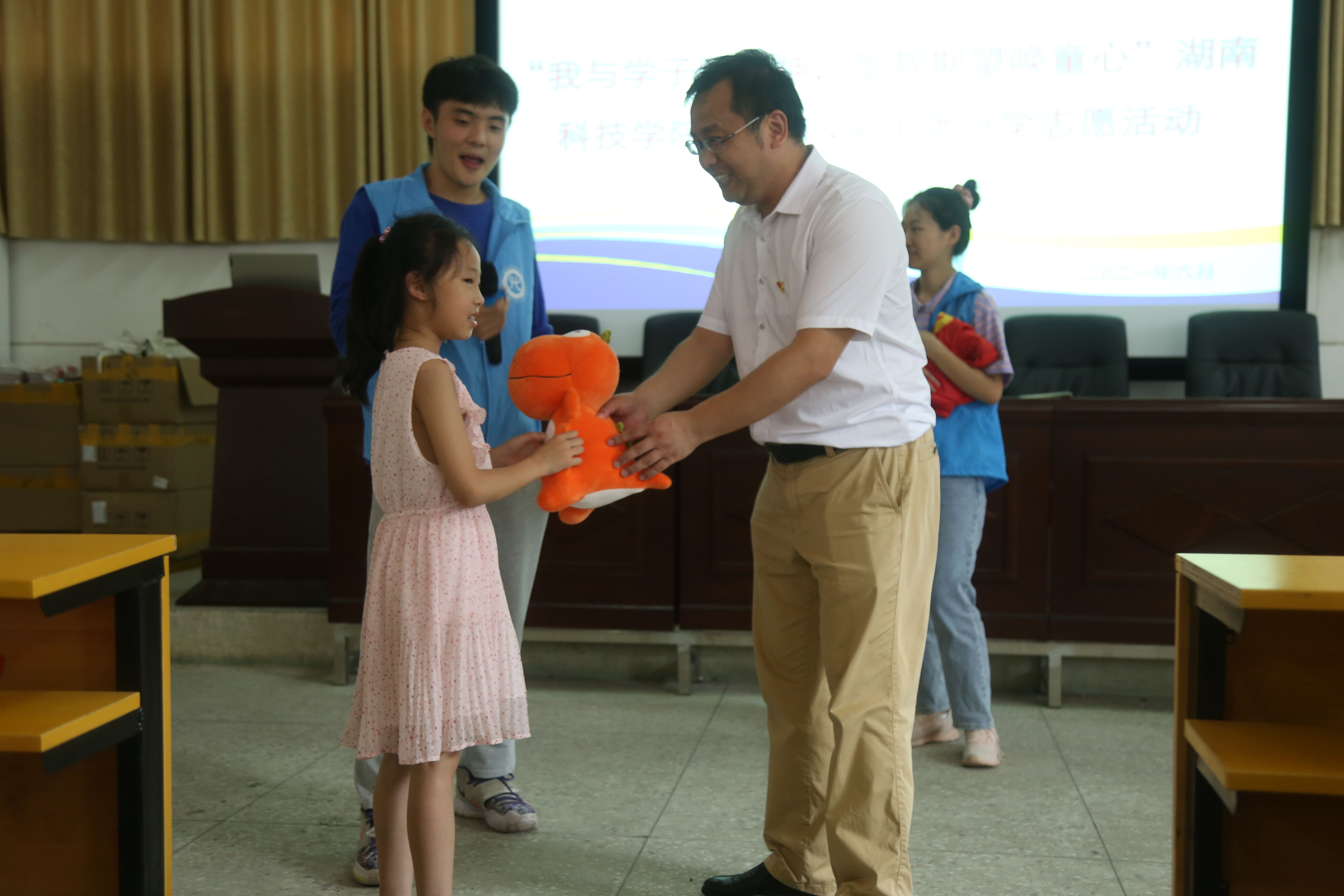 志愿者们在理学院党总支副书记黎建军的带领下,带着募捐到的两大箱游戏玩具、学习用品、全新的生活用品等爱心物资,一同去往零陵区南津渡小学进行爱心捐赠,在互动中,志愿者们将这些充满爱意的礼物分发给了在场50多名小朋友,他们也为志愿者们表演了精心准备的小节目。每一份默默付出的爱,总在无形当中获得回报,在点滴中传承了“奉献、友爱、互助、进步”的志愿者精神。