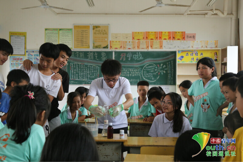 图为志愿者老师在演示制氧实验。中国青年网通讯员 周亮君 摄