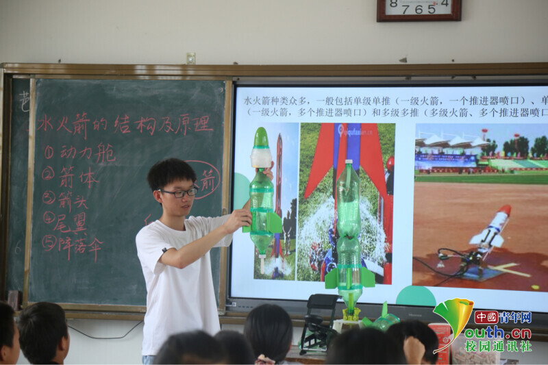 图为志愿者老师在讲解水火箭的结构及科学原理。中国青年网通讯员 周亮君 摄