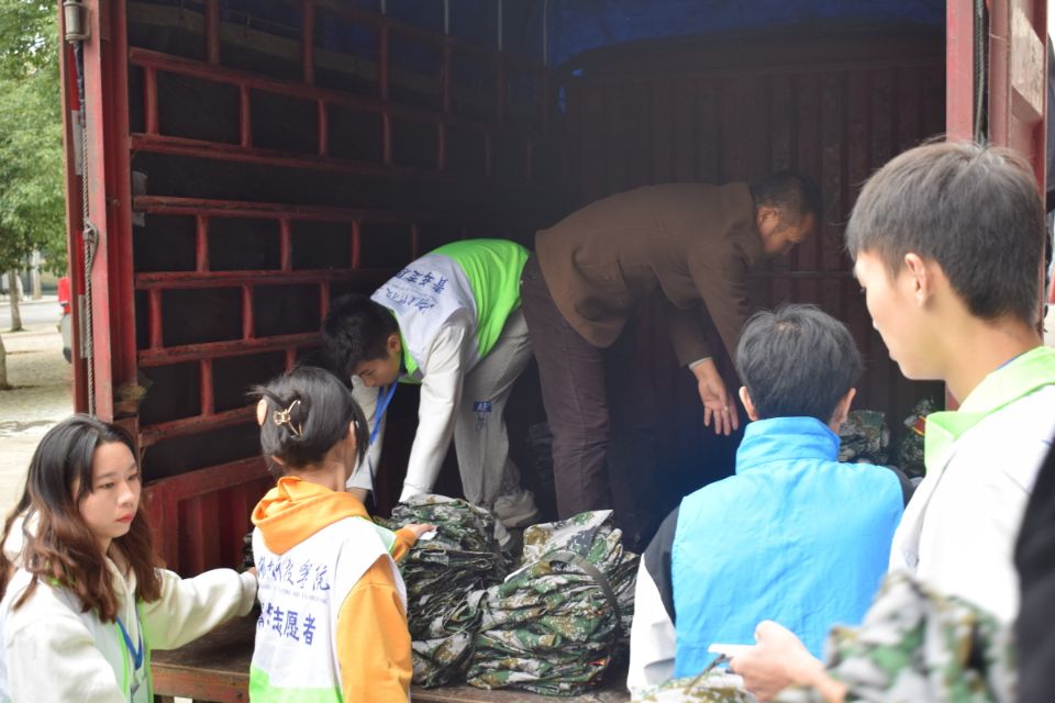10月9日至10月13日,明理楼大厅里都是志愿者忙碌的身影,男生将军训服装按尺寸大小分类,女生把每个尺寸的衣服裤子折叠并打包好,大家干得热火朝天,在学院志愿者的团结协作下,2000余套军训服被整齐地叠放好。10月23日下午,校团委书记万李、理学院党总支副书记黎建军、学生第一支党支部书记赵江南出席军训服捐赠交接仪式,组织志愿者们有序地将军训服搬运到永州义工协会、江永县邑口村、新田县潮水铺村三个捐赠单位的车上,迷彩服将开启新的征程。