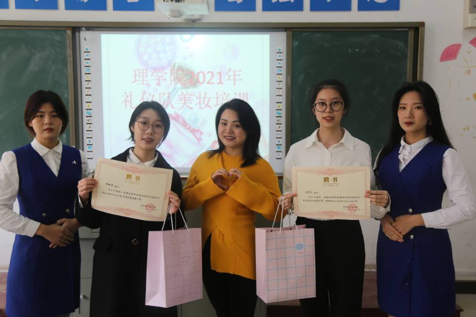 活动开始,20级、21级礼仪队成员皆素颜入场落座,18级杨欢洪学姐为在场的礼仪队成员细致地讲解了每一步的化妆技巧,每个人都专注听讲,积极配合学姐,并自己动手实践化妆,遇到问题时,各位成员互动交流,互相帮助,学姐还亲手为成员们修改妆容上的瑕疵,现场氛围十分和谐,最后大家都学会了如何打造精致和得体的妆容。活动结束,谢美老师为两位18级老队员代表颁发荣誉证书和小礼品,并完成18级老队员退役与21级新队员入队交接仪式。