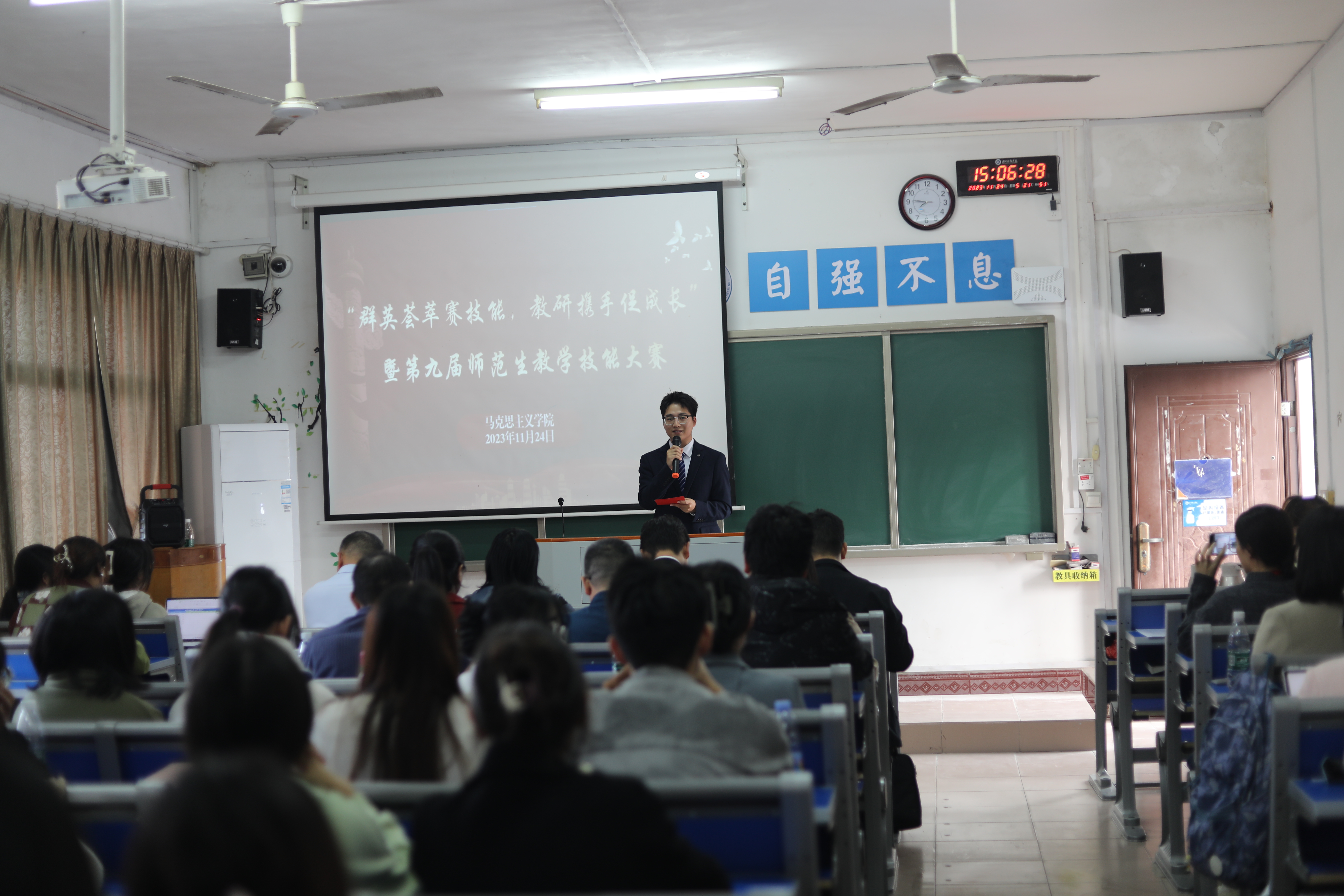 本网讯(记者 郭瑞)为展示新时代教研技能人才的风采风貌,助推团队培养,提升思想政治教育学生的专业素质。11月24日下午,马克思主义学院于鹤鸣楼501教室举办“群英荟萃展技能,教研携手促成长”主题教学技能大赛。