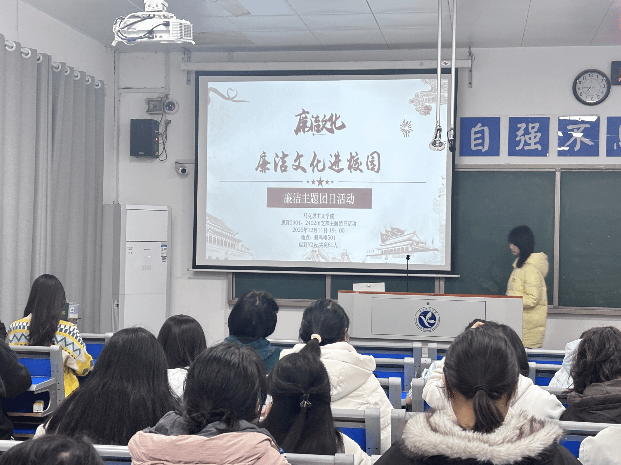 本网讯(记者 吴志伟)为引导青年学子树立廉洁自律意识,筑牢思想道德防线,12月11日,马克思主义学院在鹤鸣楼501教室举办“坚守廉洁底线,永葆廉洁本色”主题团日活动。
