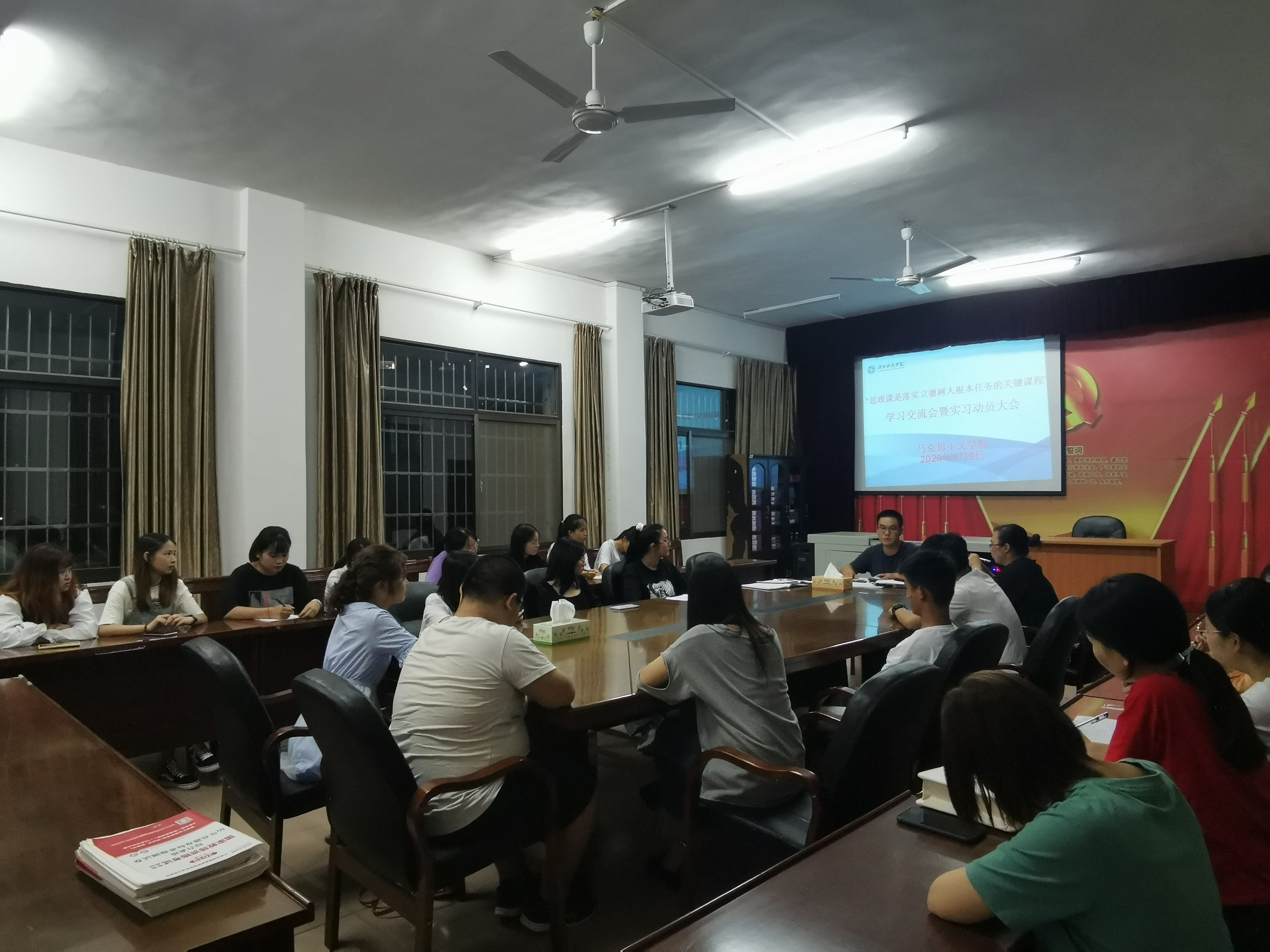 本网讯(通讯员胡非)为加强顶岗实习生的职业教育,提升学生政治素养,马克思主义学院年9月9日晚在鹤鸣楼405会议室举行《思政课是落实立德树人根本任务的关键课程》学习交流会暨顶岗实习动员会。会议由学院副书记兼副院长高丹主持,2017级22名顶岗实习学生参加了此次会议。