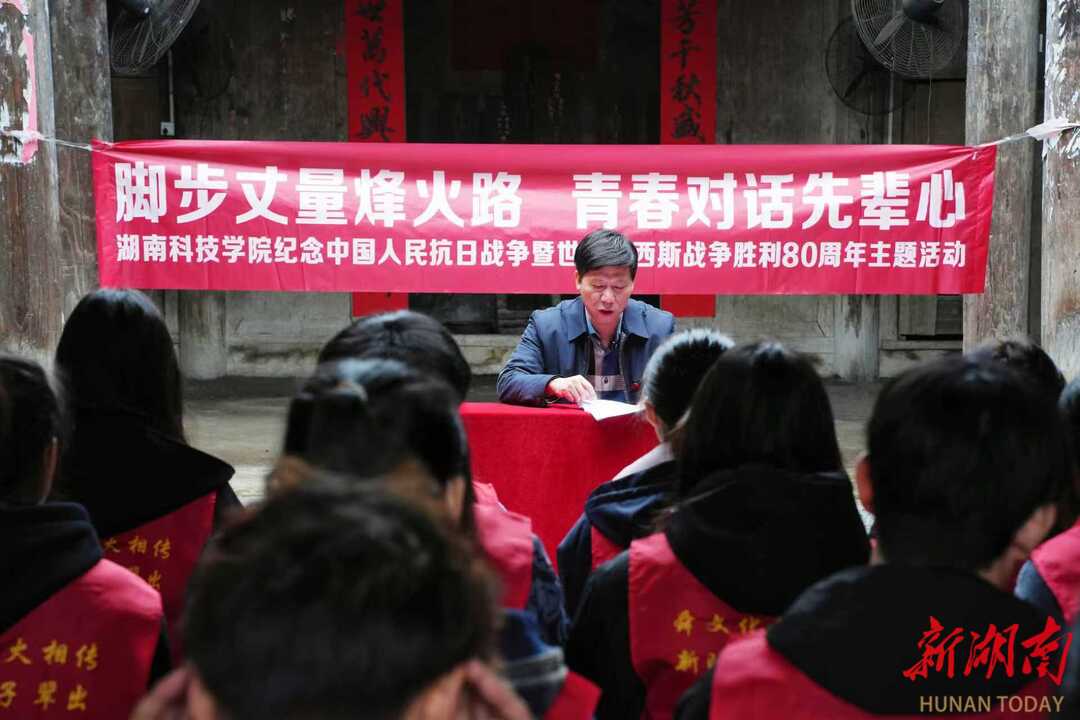 宁远县湾井乡麦地村黄家宗祠——vwin德赢ac米兰官方网前身湖南省立第七师范学校抗战时期南迁办学旧址。潘剑锋教授在此以《树立“三个不相信”才能战无不胜》为题,带领学子回顾那段烽火办学的艰辛历程。他系统讲述了1944年日寇进犯道县后,七师师生毅然“举校南迁”,辗转宁远麦地村等地,在古庙祠堂中赓续教育火种的感人历史。