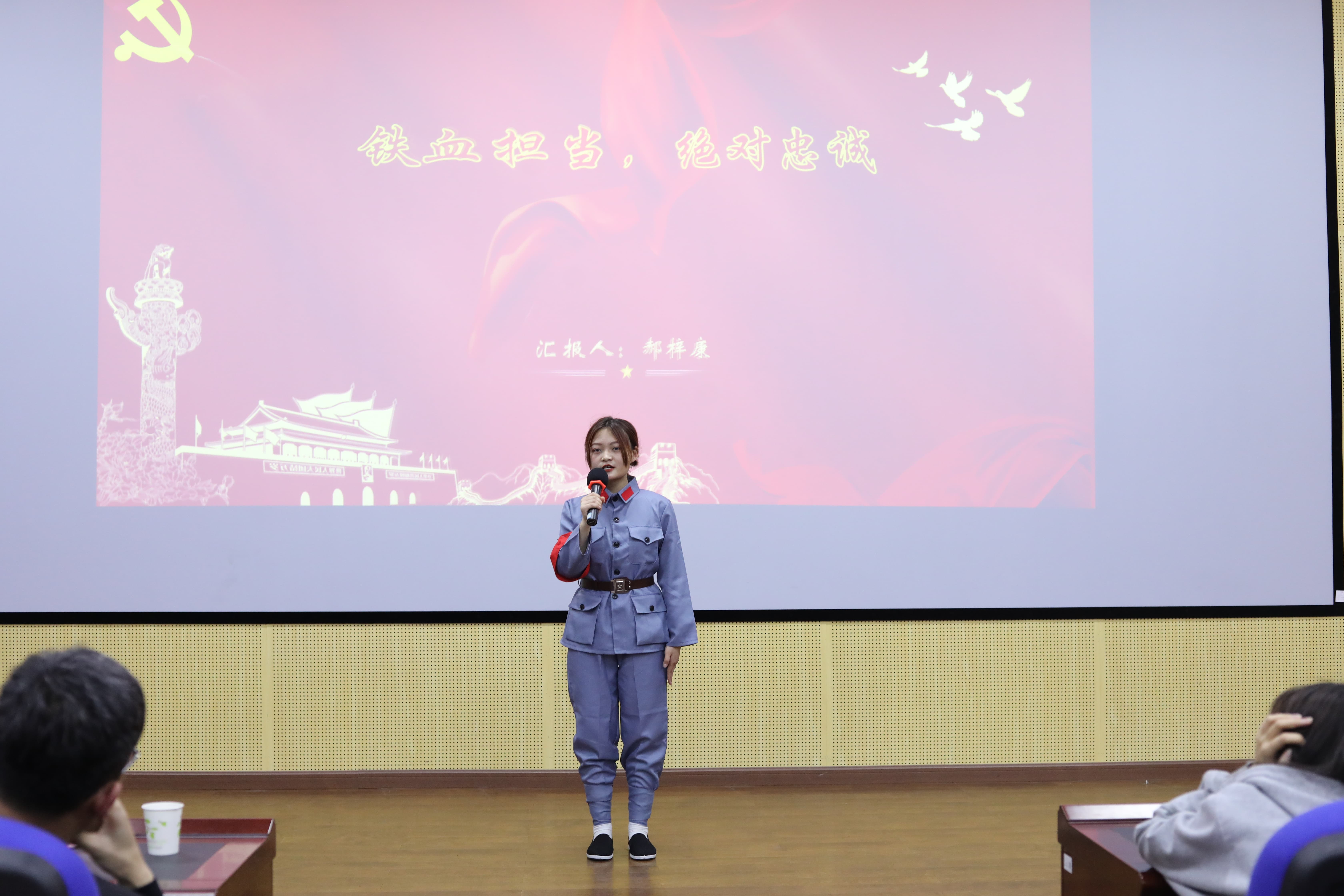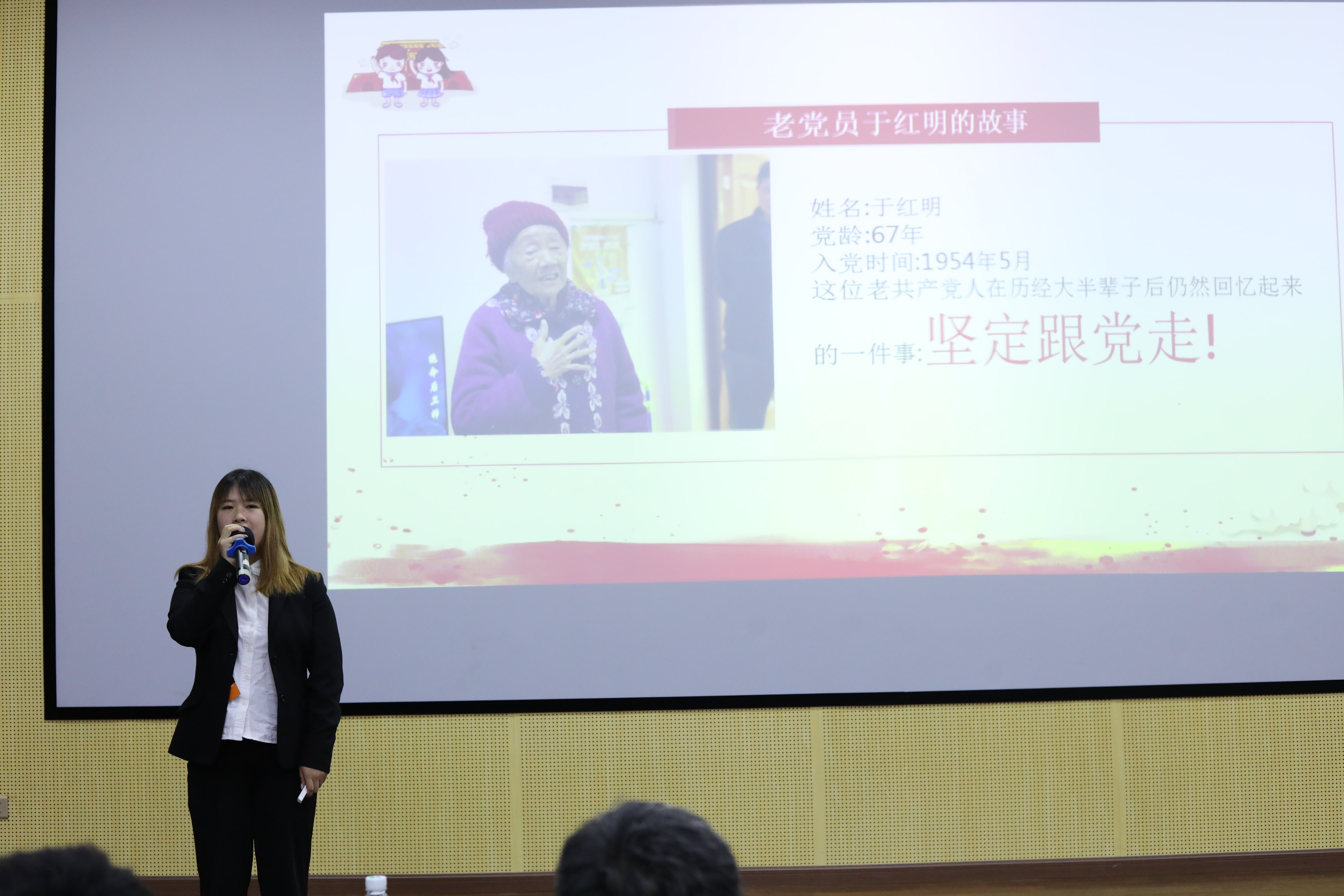 刘莎萍同学则向大家讲述了九旬退休党员于红明的故事。她说:“近百年来,一代又一代共产党人不断探索创新,铸就了伟大的新中国。作为新一代青年,我们要做坚定的理论捍卫者、忠实的初心传承者、自觉的道路践行者,大力传承弘扬革命精神,让红色基因代代传承、精神力量生生不息。”同学们为之动容,纷纷表示要怀赤子之心,投青春之躯,奉无畏之魂,在党的带领下,谱写更辉煌的篇章。