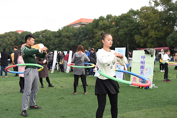 本次活动共设置了篮球投篮王、足球颠球王、跳绳王、呼啦圈王、排球垫球王、踢毽王等6项单项挑战王比赛。来自全校各个学院的近千名同学积极参加到各个单项挑战王的比拼中,比赛现场气氛热烈,高潮迭起,大家在欢乐中进行技能大比拼。足球颠球场地,只见足球在挑战者的脚背上活动自如,极有规律的上起下落,脚背、脚跟、小腿不同部位的颠球,一连串动作毫不拖泥带水;呼啦圈比赛场地,挑战者们坚持不懈高频率不间断的转动着,连场外观战的小朋友都忍不住要体验一把。最终,足球颠球挑战者以600个颠球拔得头筹,呼啦圈挑战者以17000个的成绩赢得冠军,其他项目挑战者以篮球14个,排球239个,踢毽子47个,跳绳1500个取得了各自项目的胜利。