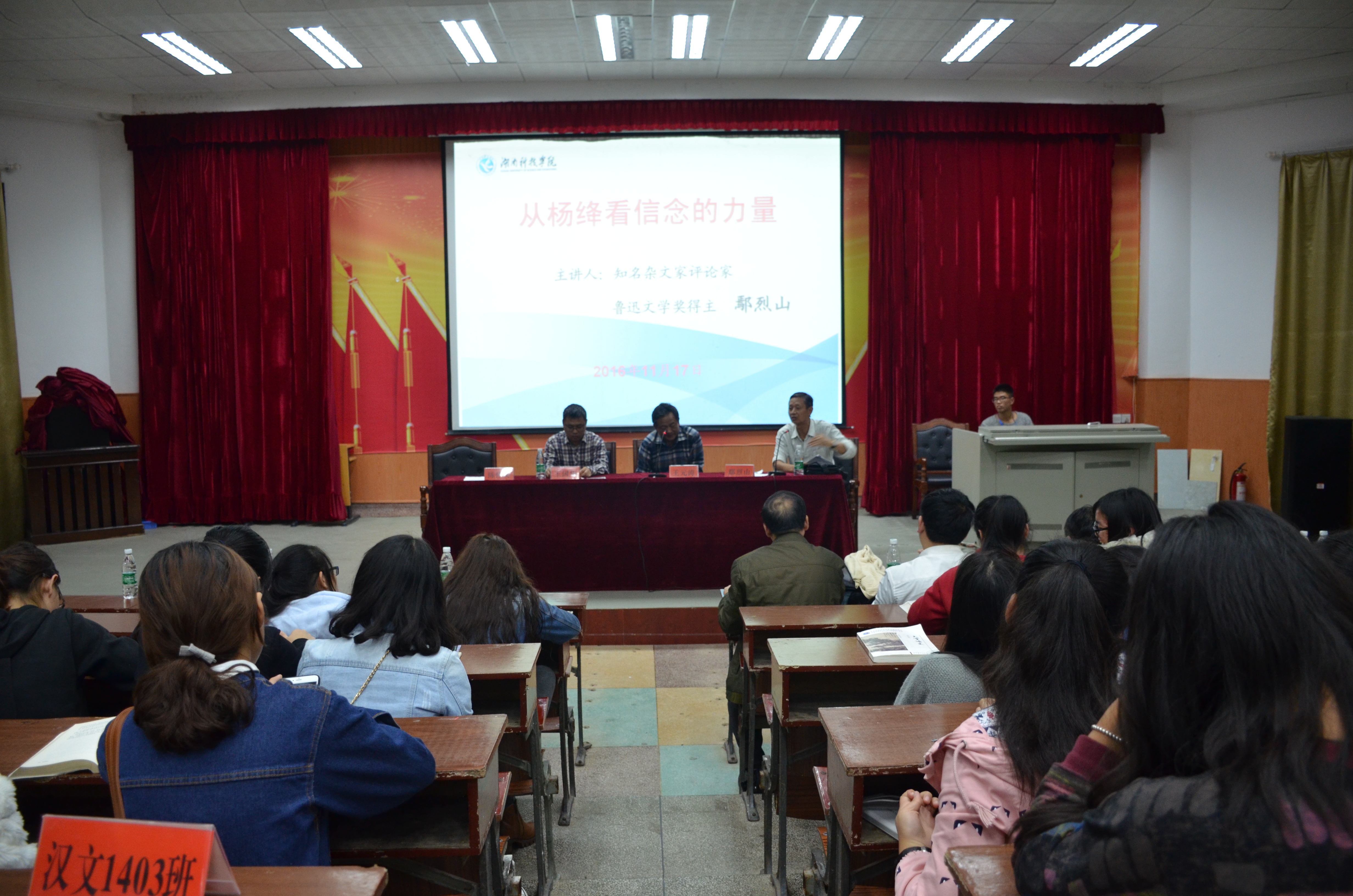 本网讯 11月17日下午,知名杂文家、时评家,原《南方周末》总编助理,鲁迅文学奖获得者鄢烈山应邀来校讲学。鄢烈山为vwin德赢师生作了题为“从杨绛看信念的力量”的讲座。深圳《时代商家》杂志执行总编辑王元涛,深圳市杂文学会副会长、专栏作家王国华,当代作家、批评家、湖南师范大学新闻学院副教授、vwin德赢中文系91级校友魏剑美,副校级督导、工会主席陈仲庚等出席。