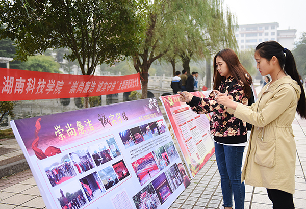本网讯 11月7日,由理学院承办的学生廉洁教育活动“崇尚廉洁,诚实守信”主题专栏评比在爱莲湖畔举行。校党委副书记唐艳明、副校长吴小林兴致勃勃前往观展。
