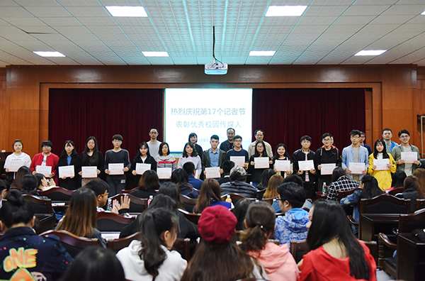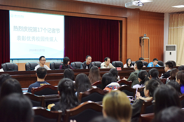 本网讯 11月7日晚,来自全校新闻战线的200余名校园传媒人齐聚,共同庆祝第十七个记者节,同时表彰一批新闻宣传工作者。校党委宣传统战部部长杨涛带领宣传部老师及来自新闻中心记者站、“校园之声”广播台、校园网络电视台、新媒体中心及大学生新闻通讯社、播音与主持协会、新媒体协会的校园传媒人共庆自己的节日。