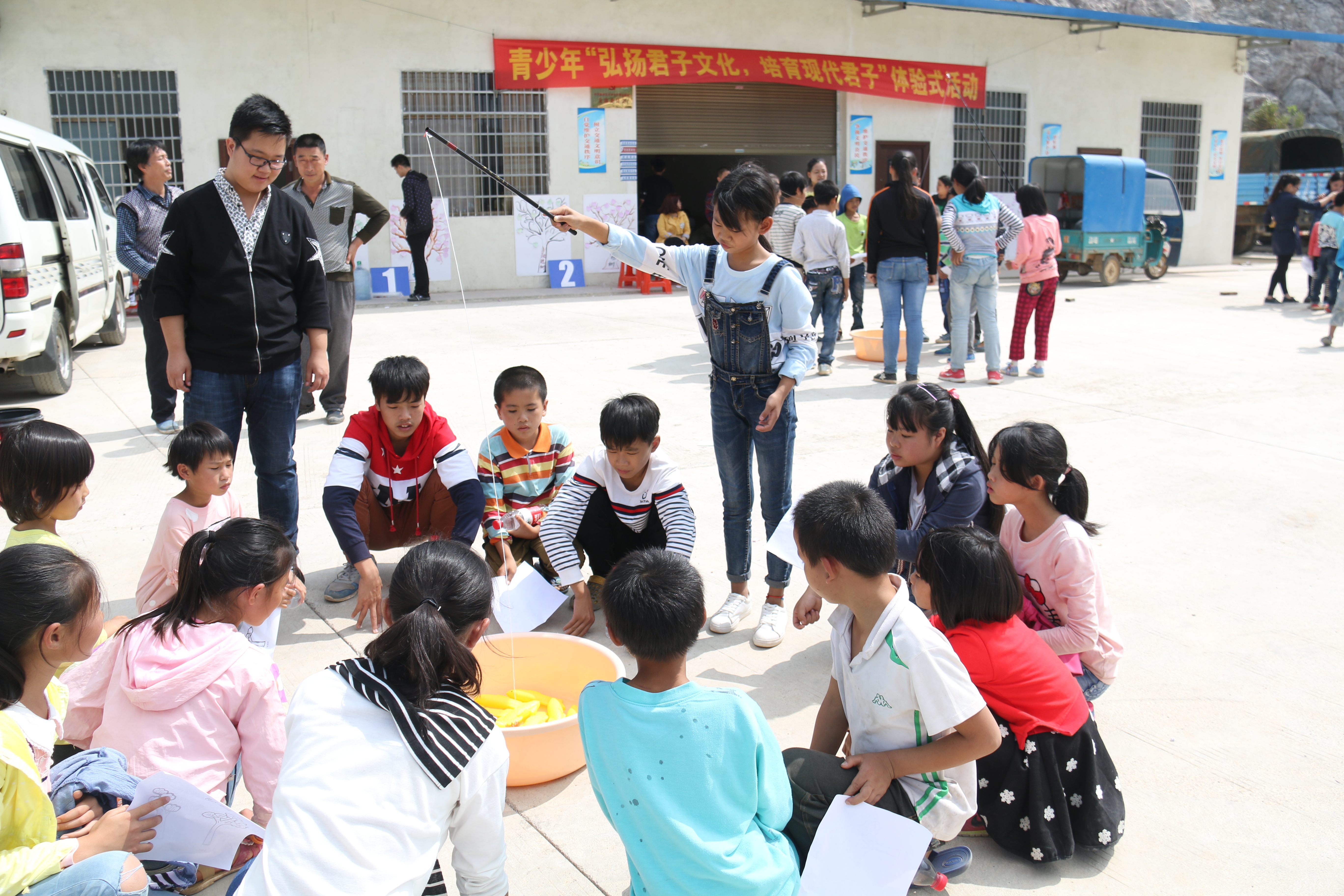 “机智垂钓”环节目的是学习和践行君子文化,孩子们先通过钓鱼的方式找到义勇文化、仁爱文化、智慧文化、自强文化、修身文化五种君子文化,再按照自己的理解,用生动的情景剧和朗诵的形式对君子文化进行演绎和诠释,更深刻的理解君子文化。