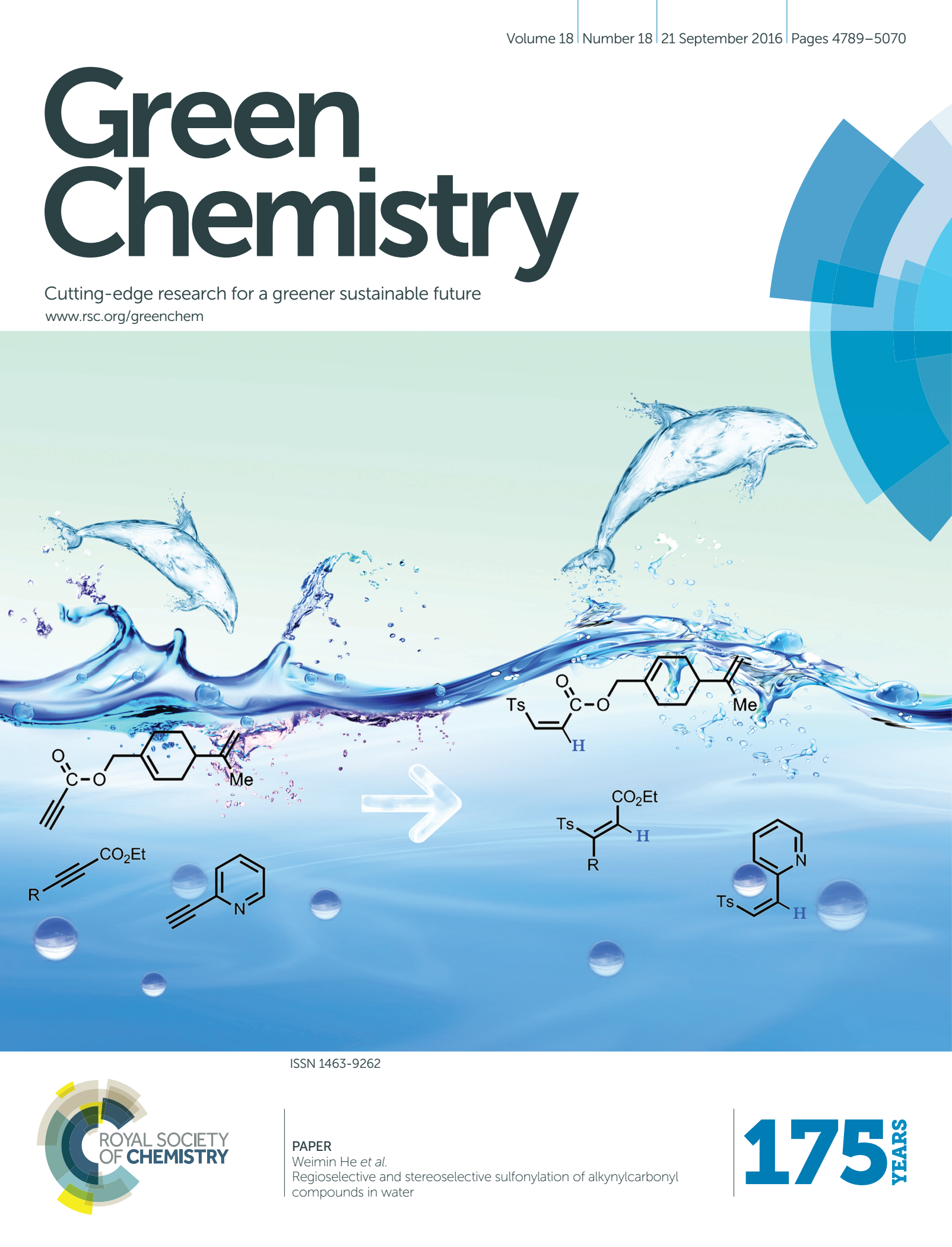 本网讯 近日,vwin德赢化学与生物工程学院李文艺博士以第一作者身份,在英国皇家化学会高端SCI学术期刊Green Chemistry上发表封面论文,该论文是由vwin德赢作为唯一研究单位独立完成,论文题为“Regioselective and Stereoselective Sulfonylation of Alkynylcarbonyl Compounds In Water”。
