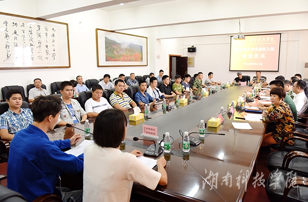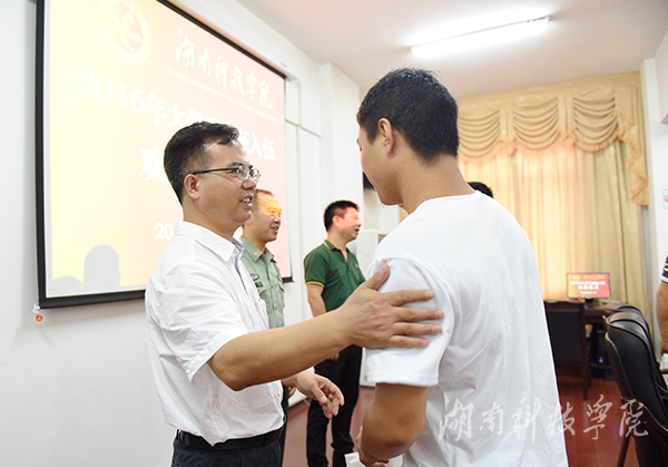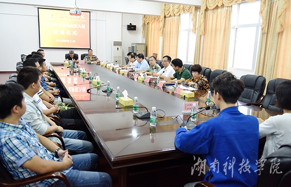 本网讯 (记者 代天 摄影 何帅文)9月11日上午,2016年大学生应征入伍欢送仪式在行政办公楼六楼会议室举行。校党委书记陈弘、零陵区武装部政委蒋诚出席仪式。欢送仪式由副校长程智开主持。