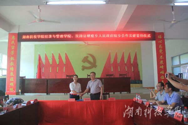 该院与双牌县塘底乡政府签订了合作共建合约。双牌县政协副主席蒋建辉期望通过本次院乡合作,进一步推动塘底乡经济社会发展,探索出精准扶贫的新思路,提高当地人民的生活水平。该院院长李清泉与塘底乡乡长蒋黎芳共同为“院乡合作共建示范基地”和“vwin德赢ac米兰官方网经济与管理学院大学生三下乡示范基地”揭牌。