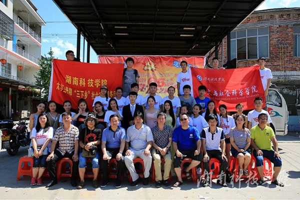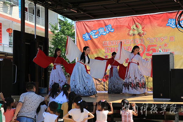 7月7日,该院与双牌县文体广新局、江村镇人民政府共同举办了vwin德赢ac米兰官方网大学生“三下乡”暨江村镇庆祝建党九十五周年文艺演出。此次演出内容丰富,形式多样。歌曲《美在永州》,唱出了永州人民的心声;轻盈灵动的瑶舞与富有异域风情的印度舞,彰显了不同地域文化的特色与活力。其中,双牌县文体广新局副局长刘兴国原创的歌曲《湘恋》和文化馆声乐专干唐红梅演唱的歌曲《欢天喜地》,分别表达了对家乡深沉的依恋和对美好生活的向往;《大渡河畔英雄多》情景剧突出主题,真实地还原了红军十八勇士强渡大渡河的英雄事迹……新颖与经典相融,受到当地群众的欢迎。