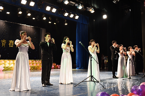 晚会现场,校领导一齐上台祝福社团联合会10周岁生日快乐。